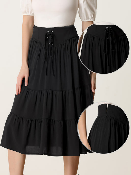Women's Boho Midi Skirt Lace-Up Smocked Back Pleated A-Line Skirt