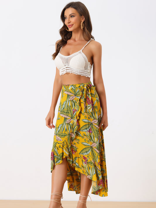 Women's Tropical Floral Print Ruffle Self Tie Knot Split Beach Wrap Skirt