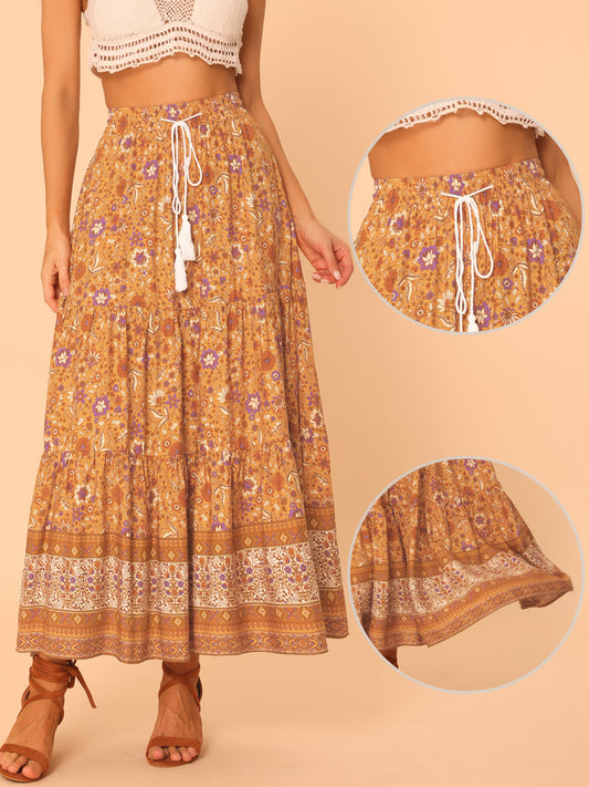 Women's Boho Skirt Summer Floral Bohemian Tassels Elastic Waist Maxi Skirt