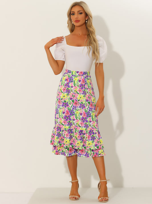 Women's Floral Midi Skirts Summer Ruffle High Waist Flowy A-Line Split Knee Length Skirt