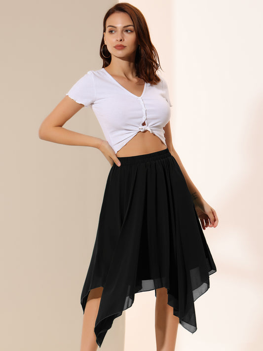 Women's Asymmetrical Hem Elastic Waist Chiffon Flowy Vintage Handkerchief Hemline Midi Skirt