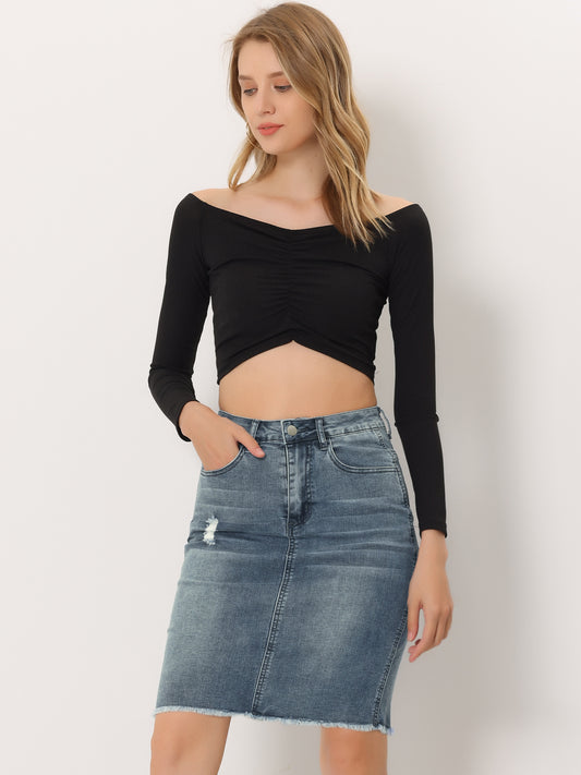 Women's Basic Distressed High Waist Ripped Hem Washed Jeans Denim Skirt