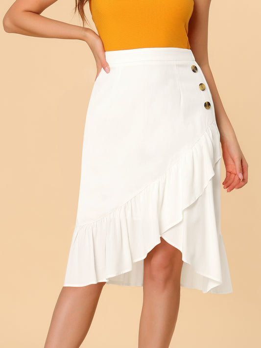 Women's High Waisted Button Decor Asymmetrical Ruffle Hem Skirt