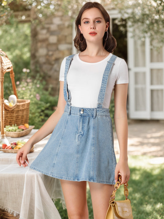 Women's Denim Skirt Overall Adjustable Strap Braces Mini Suspender Washed Jean Skirt