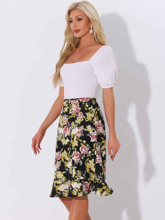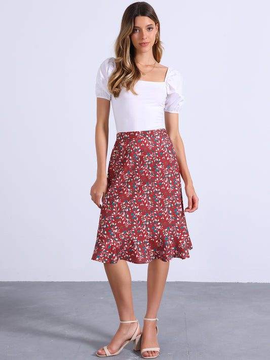 Women's Floral Midi Skirts Summer Ruffle High Waist Flowy A-Line Split Knee Length Skirt