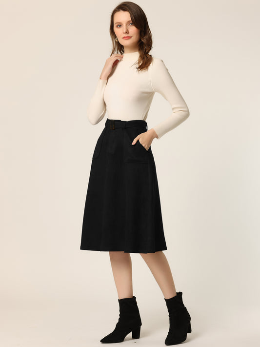 Women's Faux Suede Pockets Stretch A-Line Midi Skirt with Belt