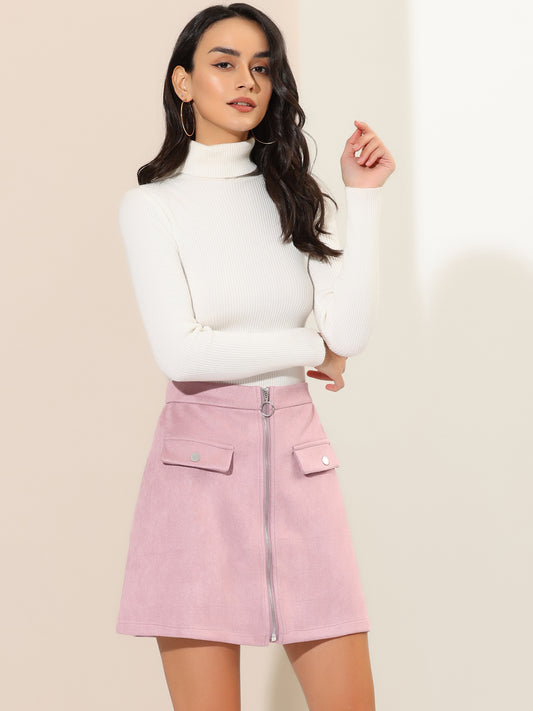 Women's Zipper Front Skirt High Waist A-Line Faux Suede Mini Skirt