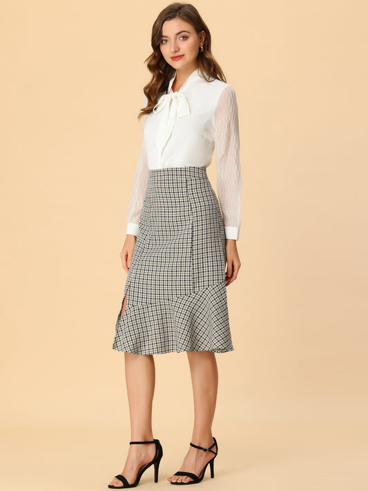 Women's Plaid Midi Skirt High Waist Split Ruffle Fishtail Skirt