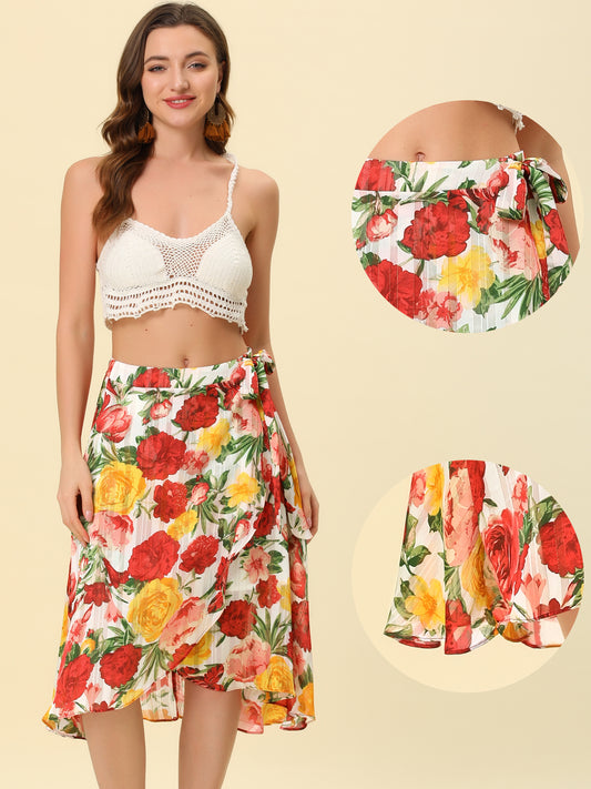 Women's Hawaiian Tropical Skirt Ruffle Pleated Hem Tie Wrap Glitter Floral Skirts