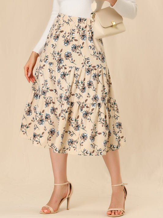 Women's Corduroy Elastic Waist Fall Winter A-Line Pockets Tiered Floral Midi Skirt