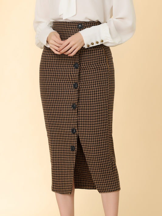 Women's Elegant Elastic Waist Button Decor Front Houndstooth Skirt