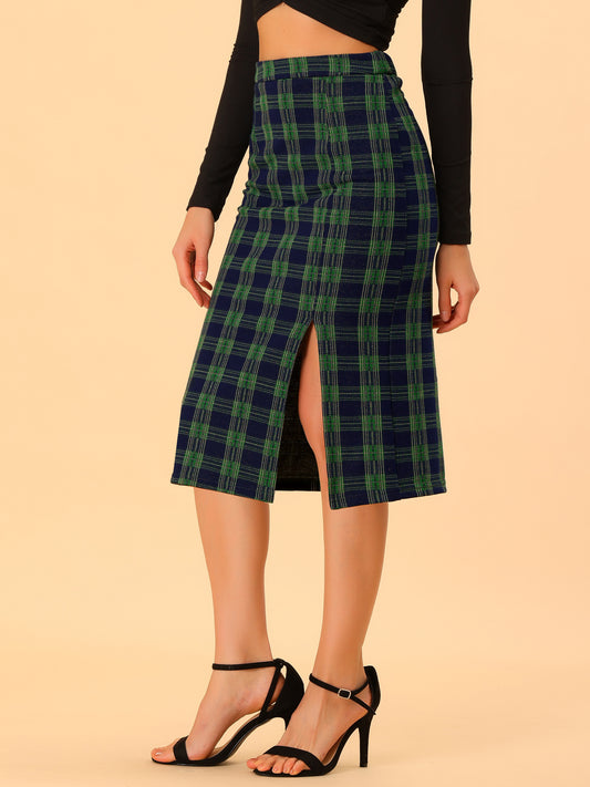 Women's Plaid High Waisted Stretchy Slit Midi Pencil Skirt