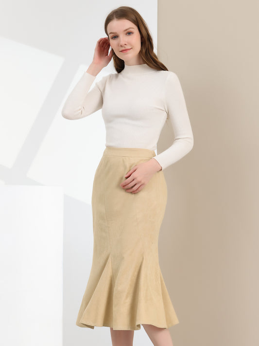 Women's Faux Suede Elastic Back Retro Work Fall Ruffle Hem Fishtail Midi Skirt