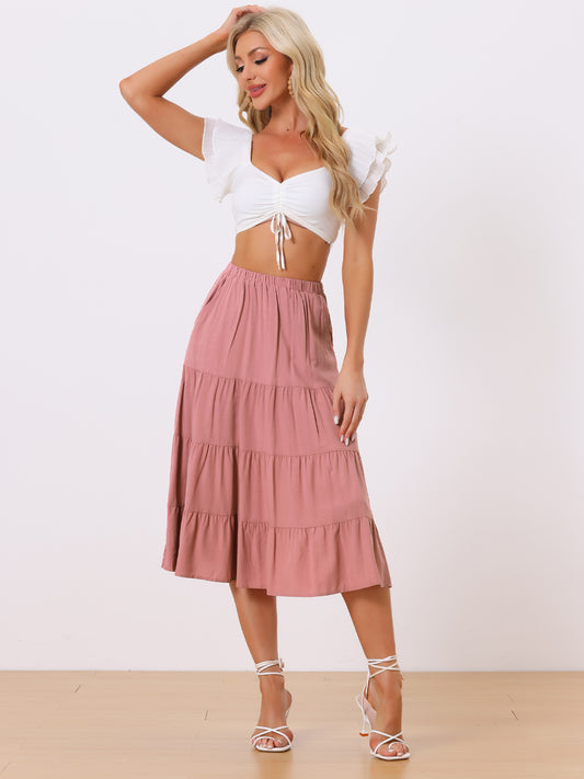 Women's Midi Skirts Flare Tiered Pleated Boho Solid Elastic Waist Long A-Line Skirt with Pockets