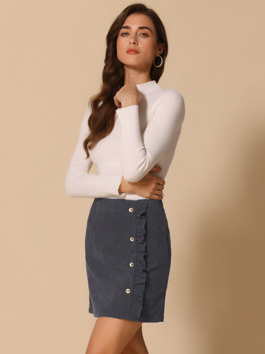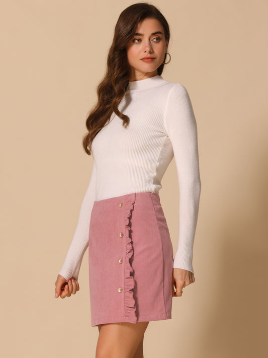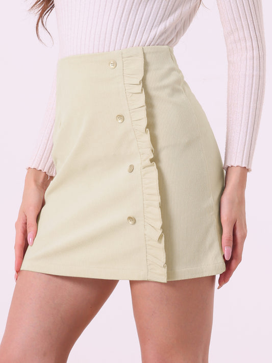 Women's Corduroy Button Decor Ruffled Trim High Waist Short Skirt