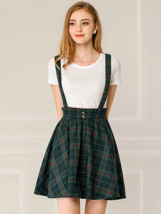 Women's Tartan Plaid Button Decor Flare Skater Suspender Skirt