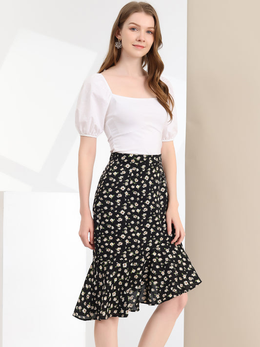 Women's Floral Eleagnt High Waist Mermaid Asymmetrical Ruffle Summer Skirt