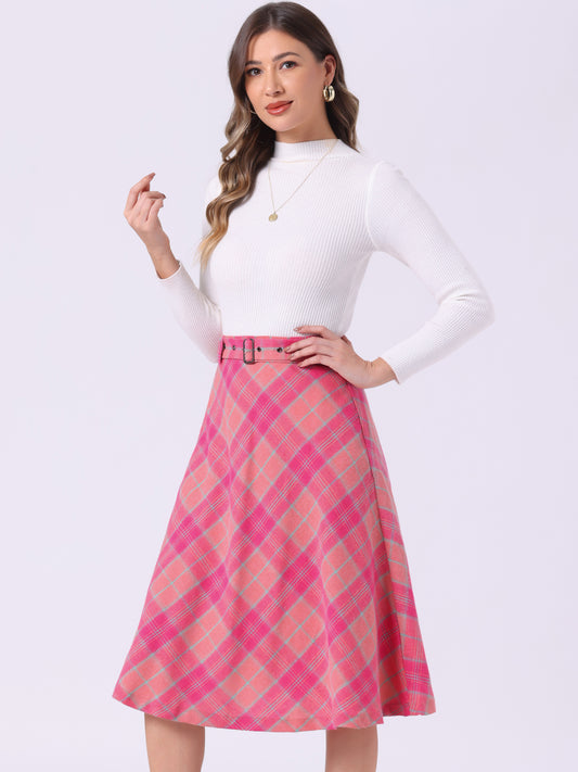 Women's Tartan Plaid High Waist Belted Vintage A-Line Midi Skirt