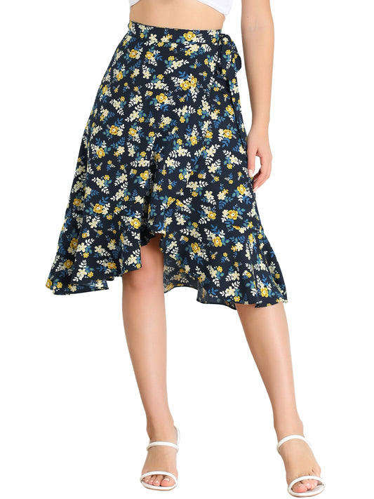 Women's Floral Printed Self Tie Knot High-Low Ruffle Hem Wrap Skirt