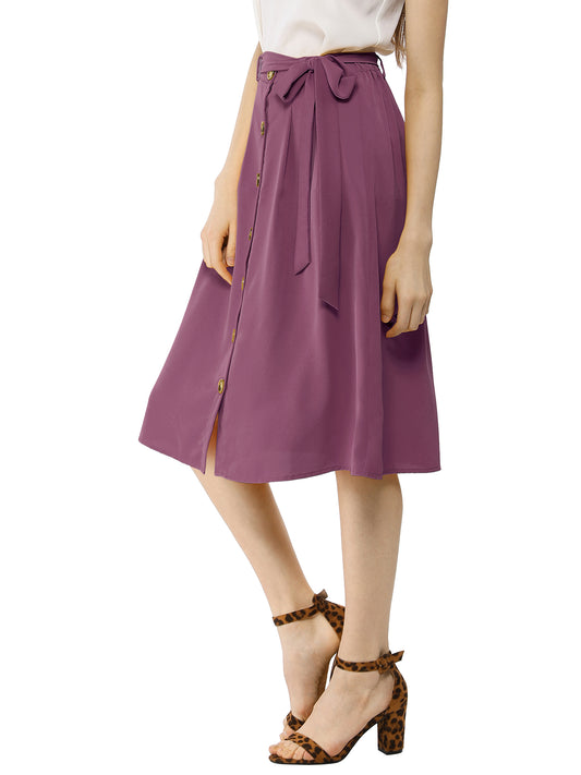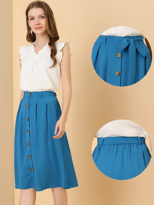 Women's High Waist Button Front Belted A-Line Casual Midi Skirt