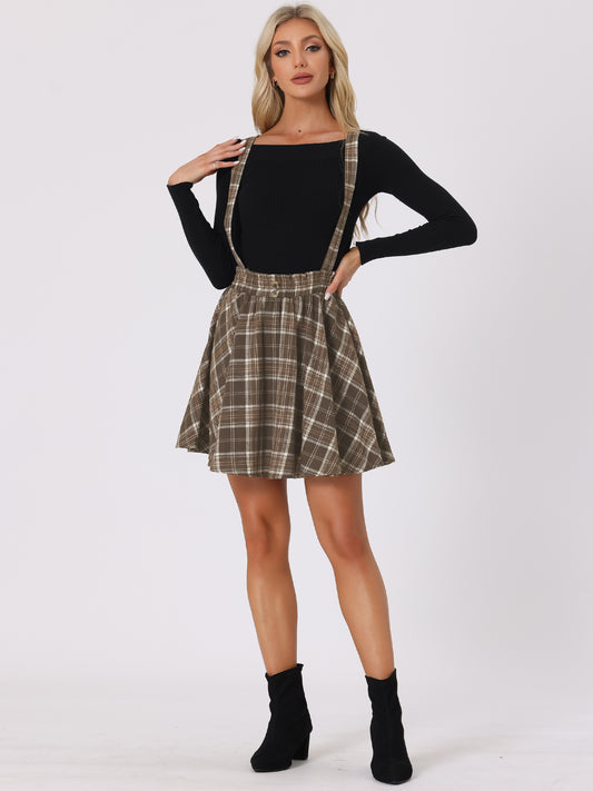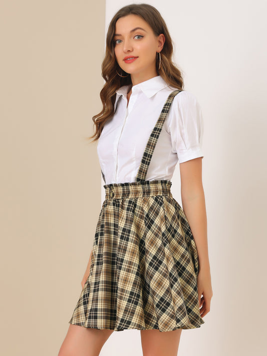 Women's Tartan Plaid Button Decor Flare Skater Suspender Skirt