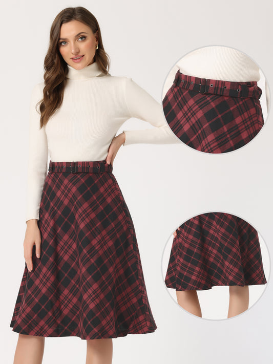 Women's Tartan Plaid High Waist Belted Vintage A-Line Midi Skirt