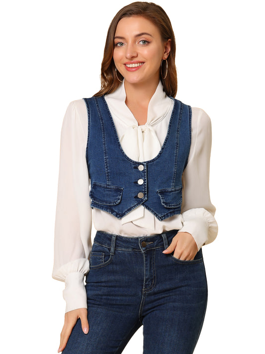 Women's Denim Vest Vintage Button Up Sleeveless Crop Jean Vest Waistcoat