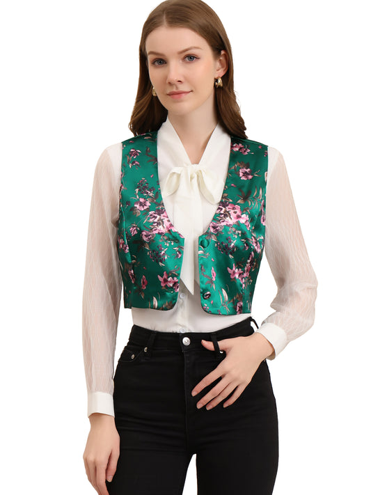 Women's Floral Pattern Vest Button Closure Cropped Satin Vintage Retro Waistcoat Vest