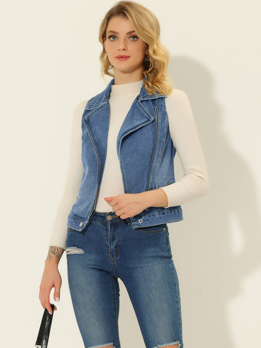Women's Sleeveless Moto Jacket Zip Up Classic Jeans Denim Vest