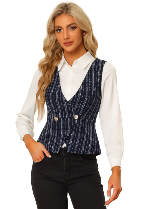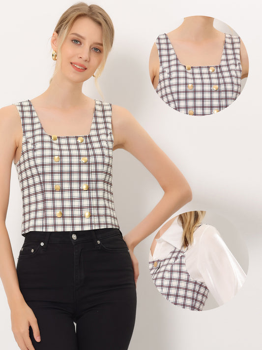 Women's Vintage Tweed Vest Double Breasted Sleeveless Plaid Waistcoat Jacket