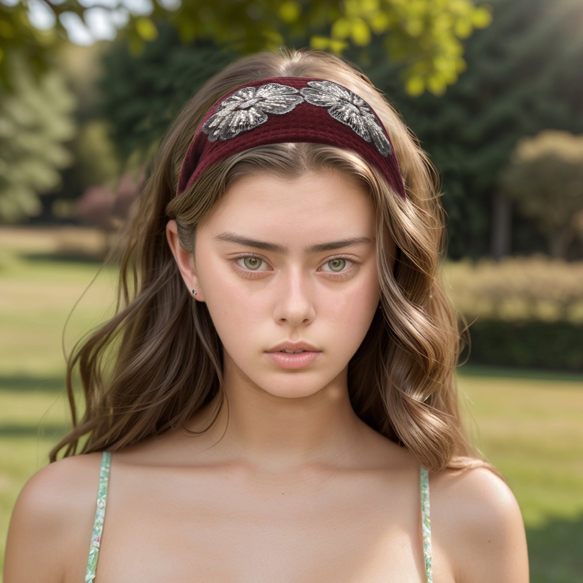 Sequin Flower Vintage Wide Headband for Women, Dark Red 1 Pc
