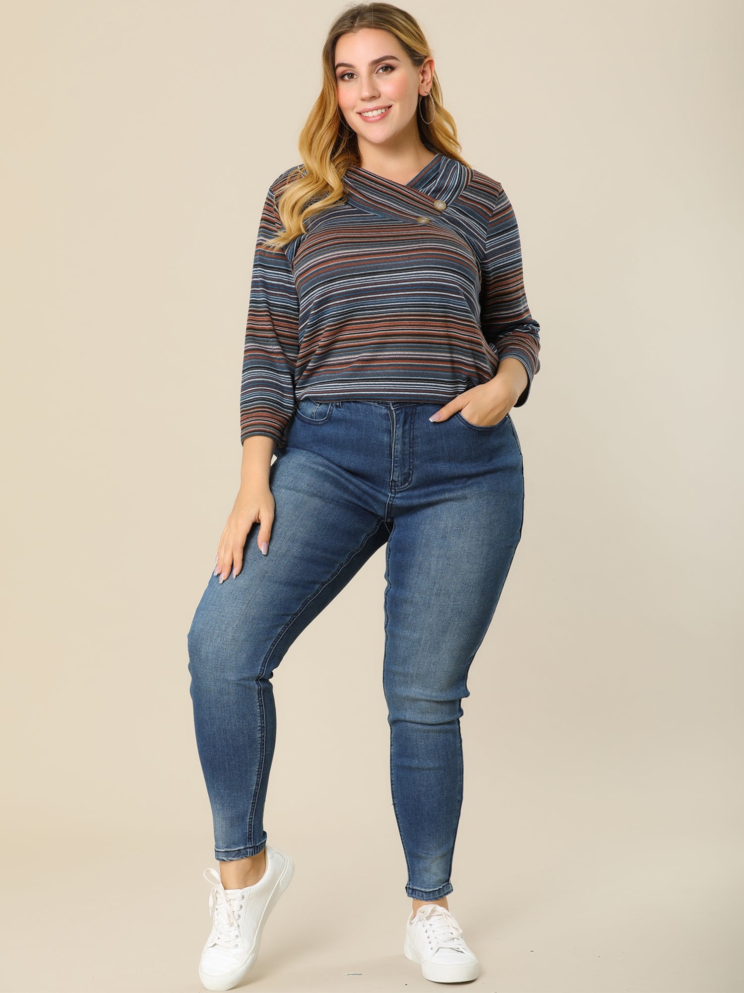 Women Plus Size Top 3/4 Sleeve Knit Striped Boho Asymmetric Neck T-Shirt Blouse