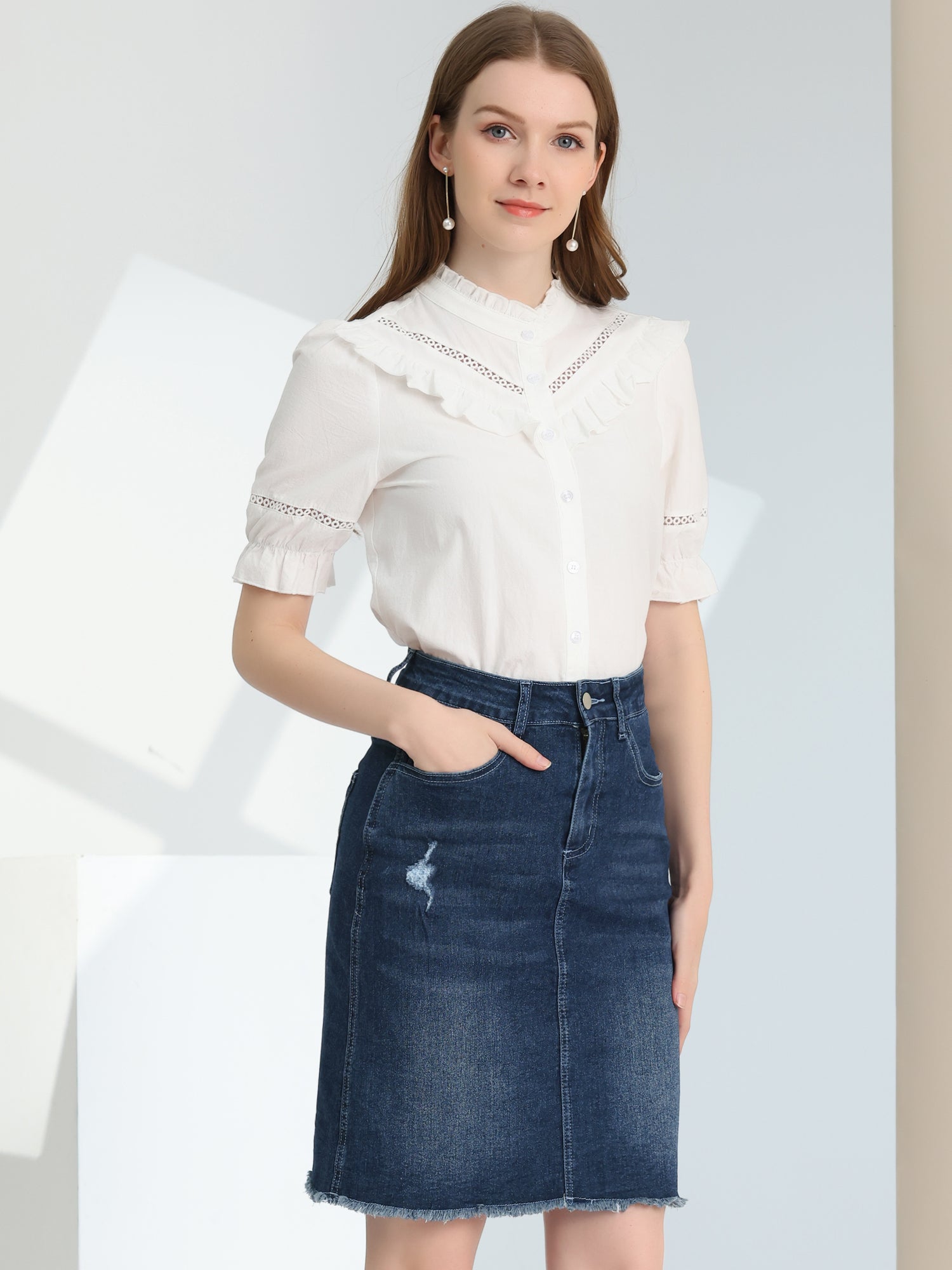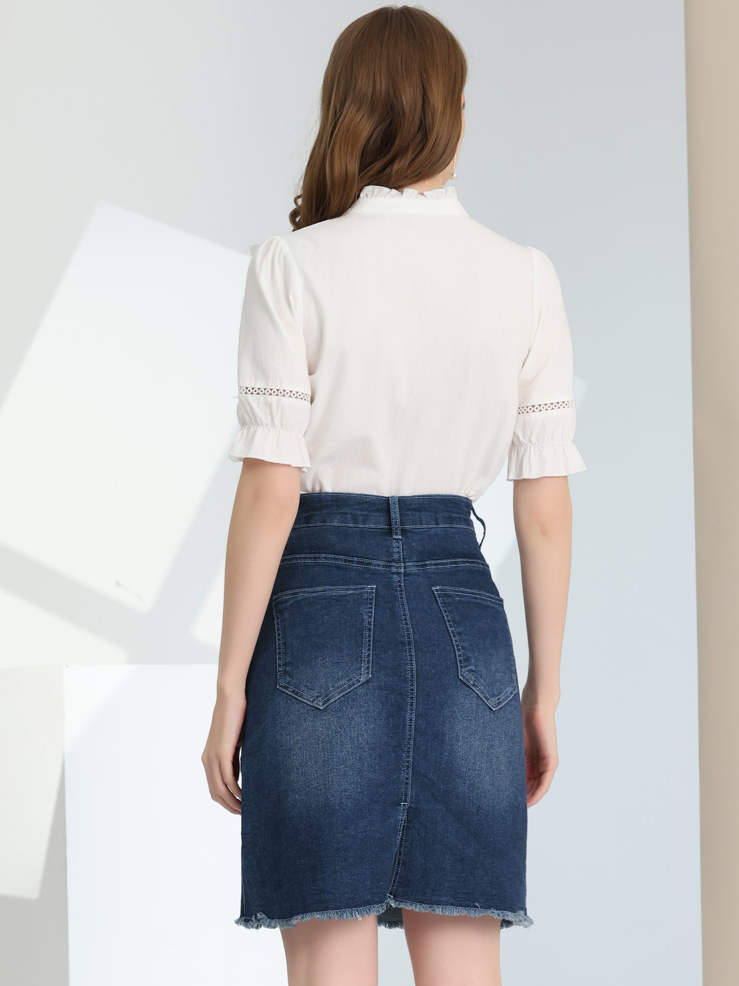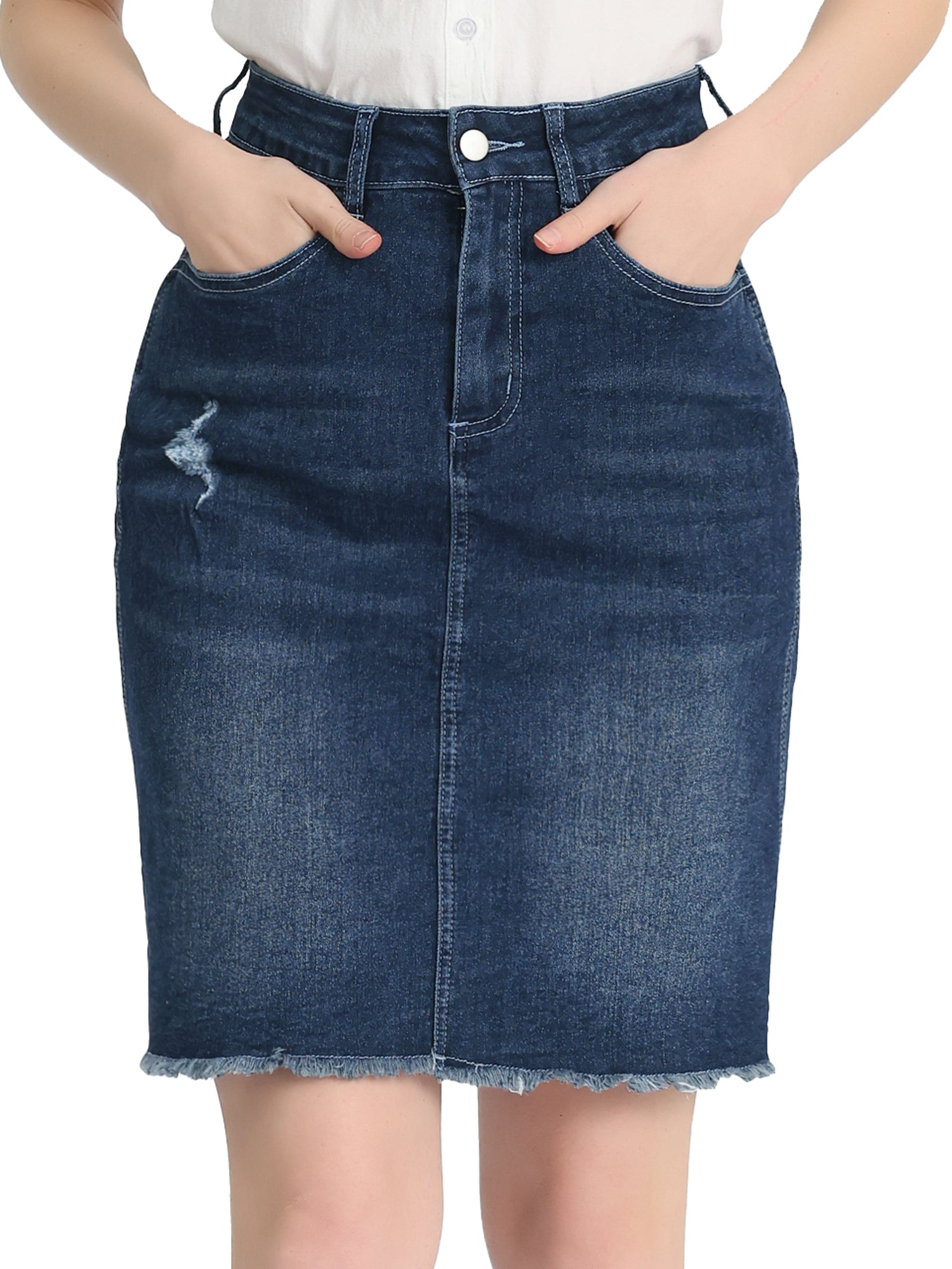 Women's Basic Distressed High Waist Ripped Hem Washed Jeans Denim Skirt (Available in Plus Size)