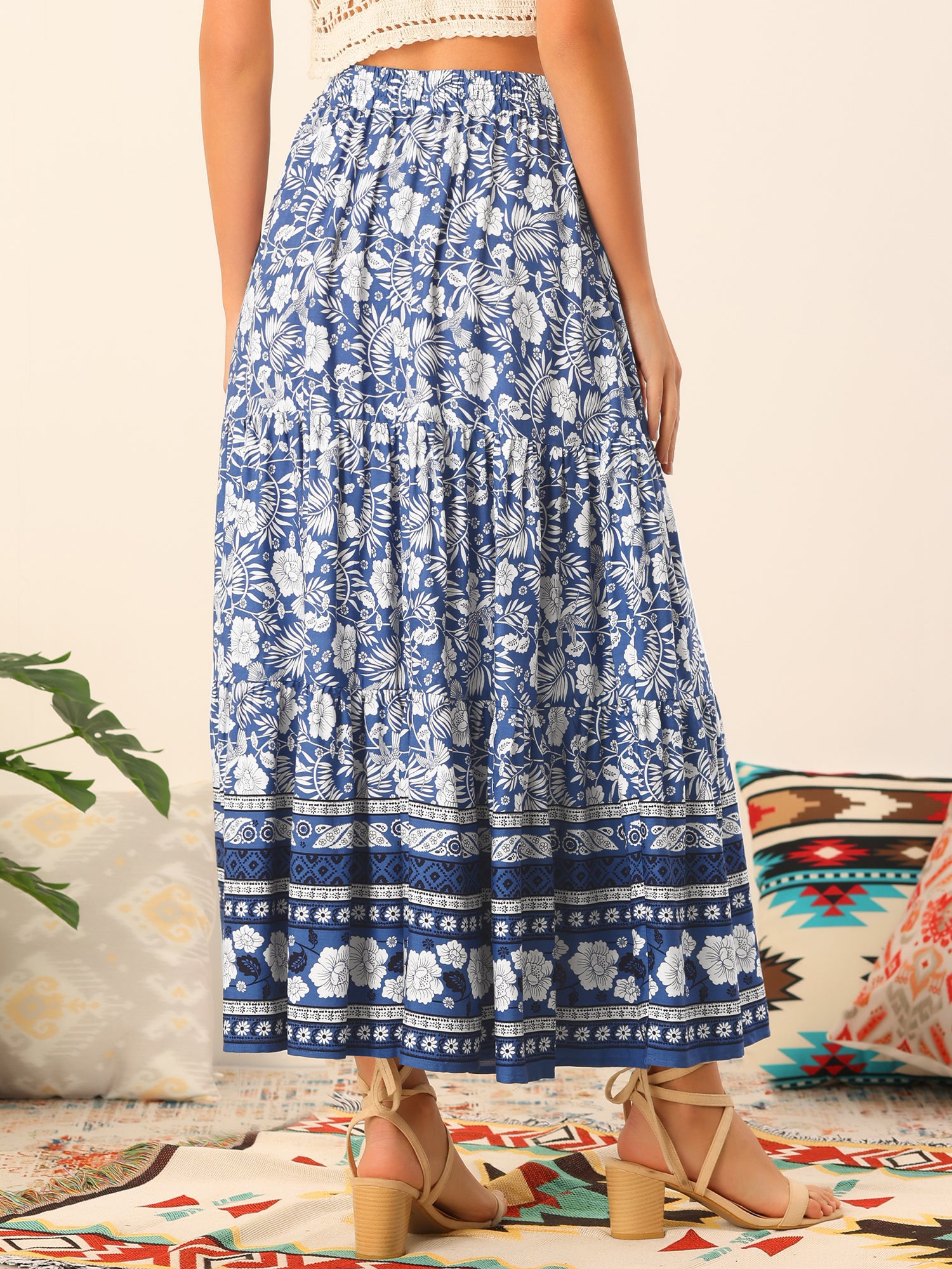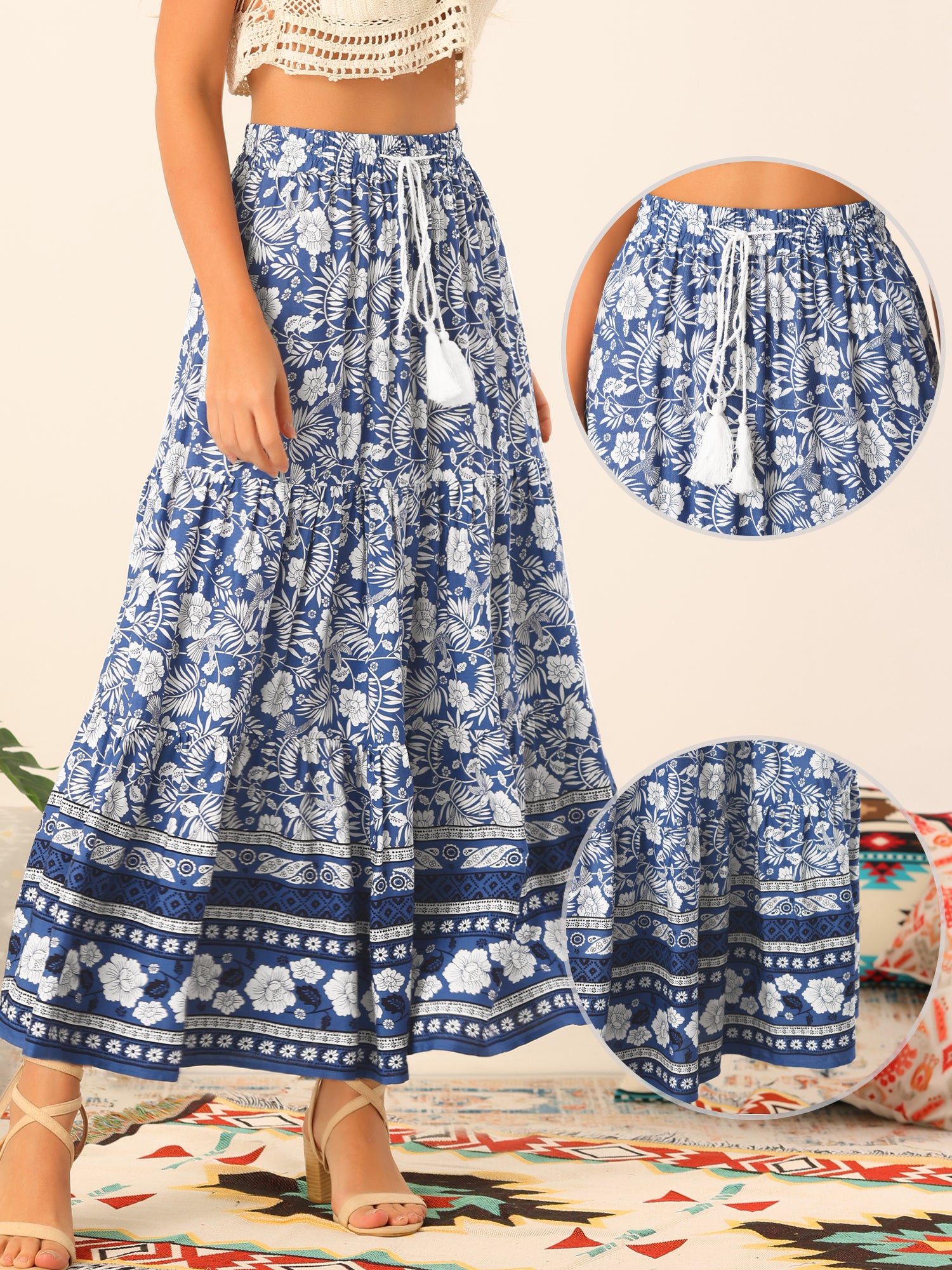 Women's Boho Skirt Summer Floral Bohemian Tassels Elastic Waist Maxi Skirt