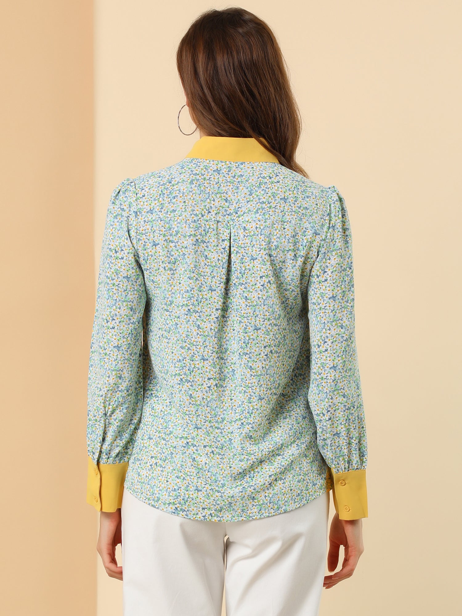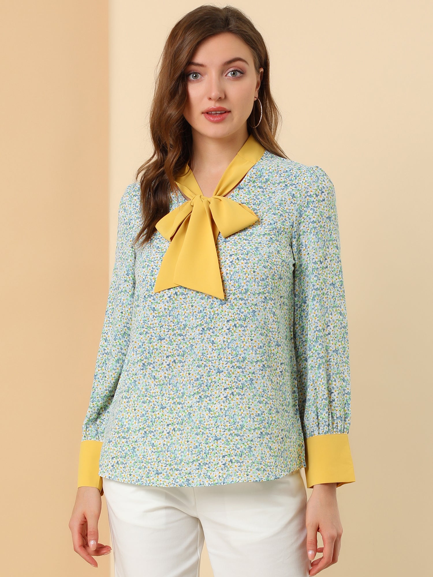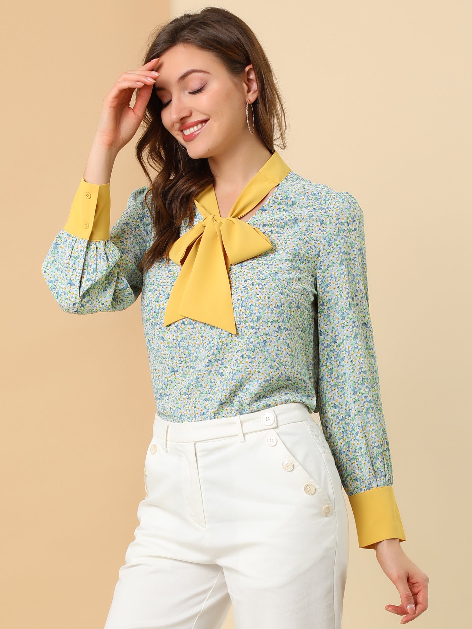 Women's Bow Tie Long Sleeve Floral Blouse