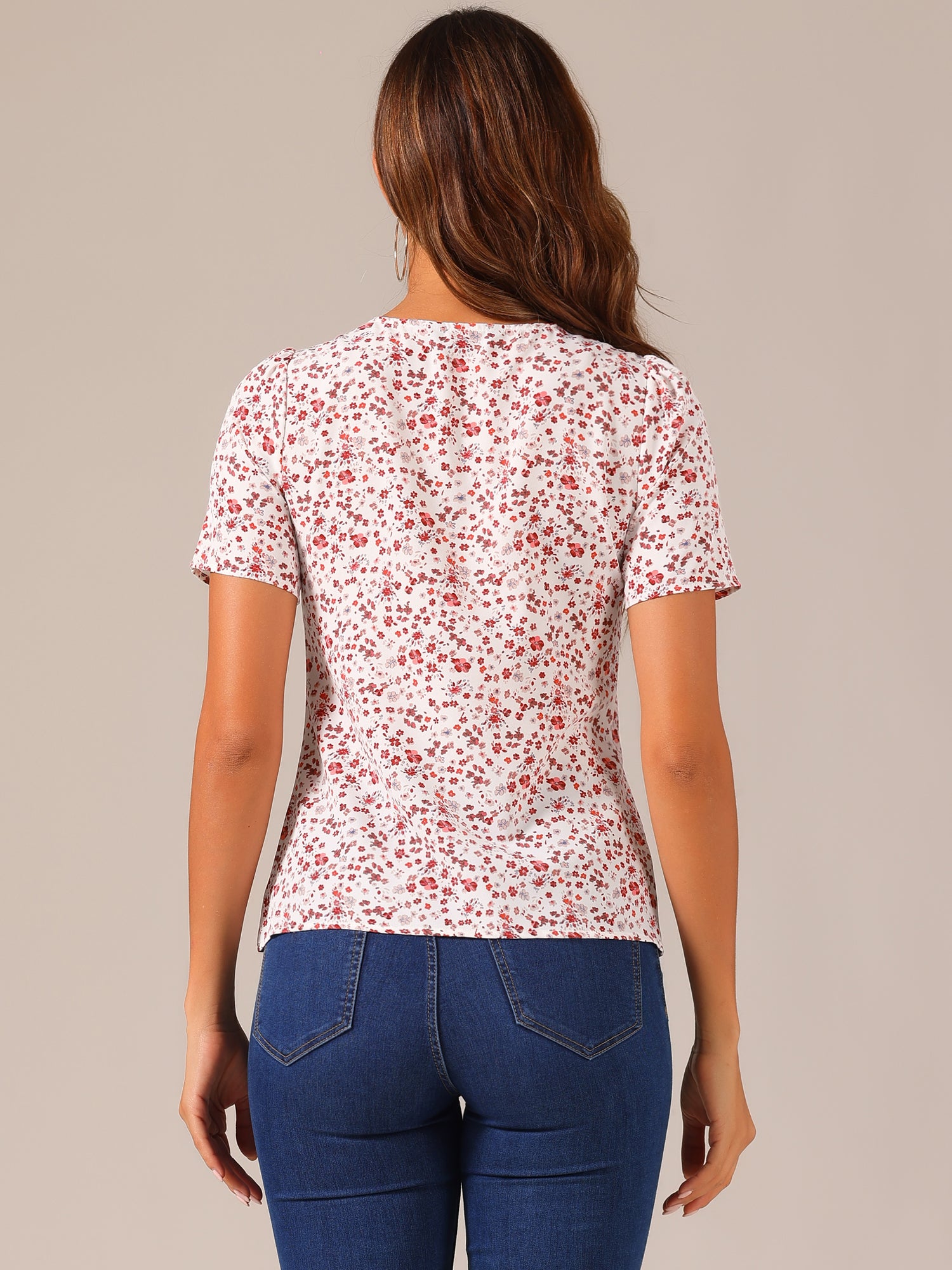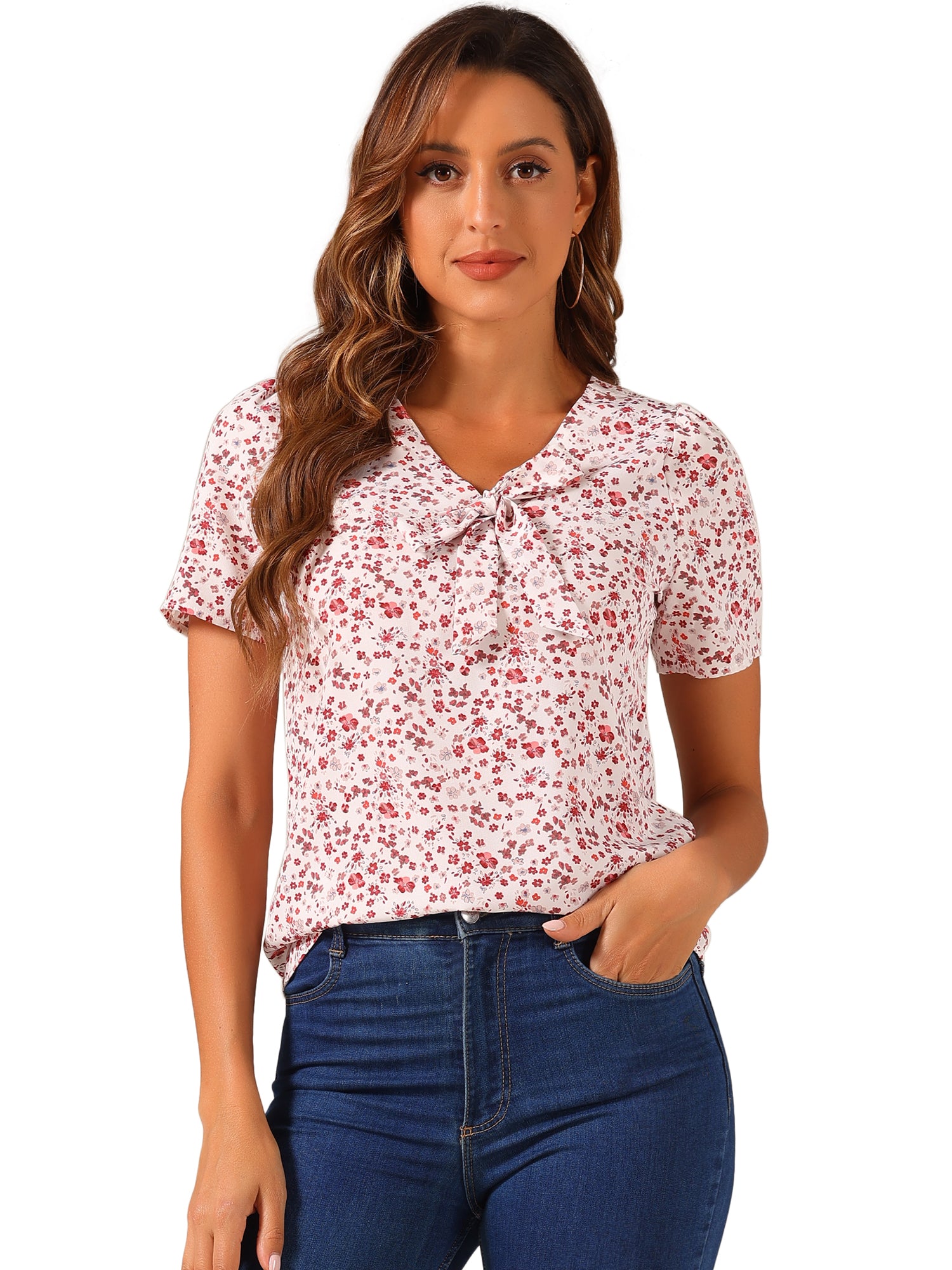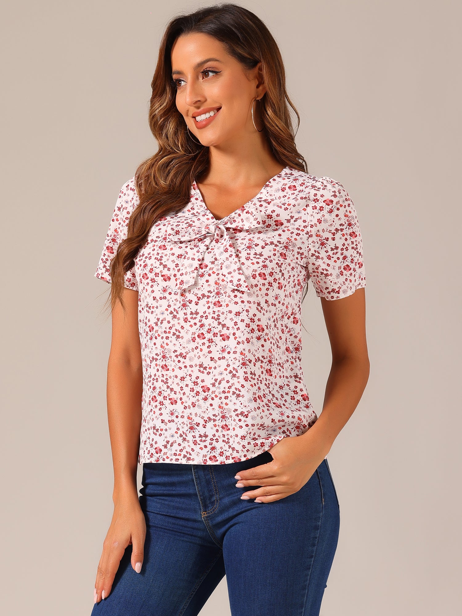 Women's Bow Tie V Neck Short Sleeve Print Blouse