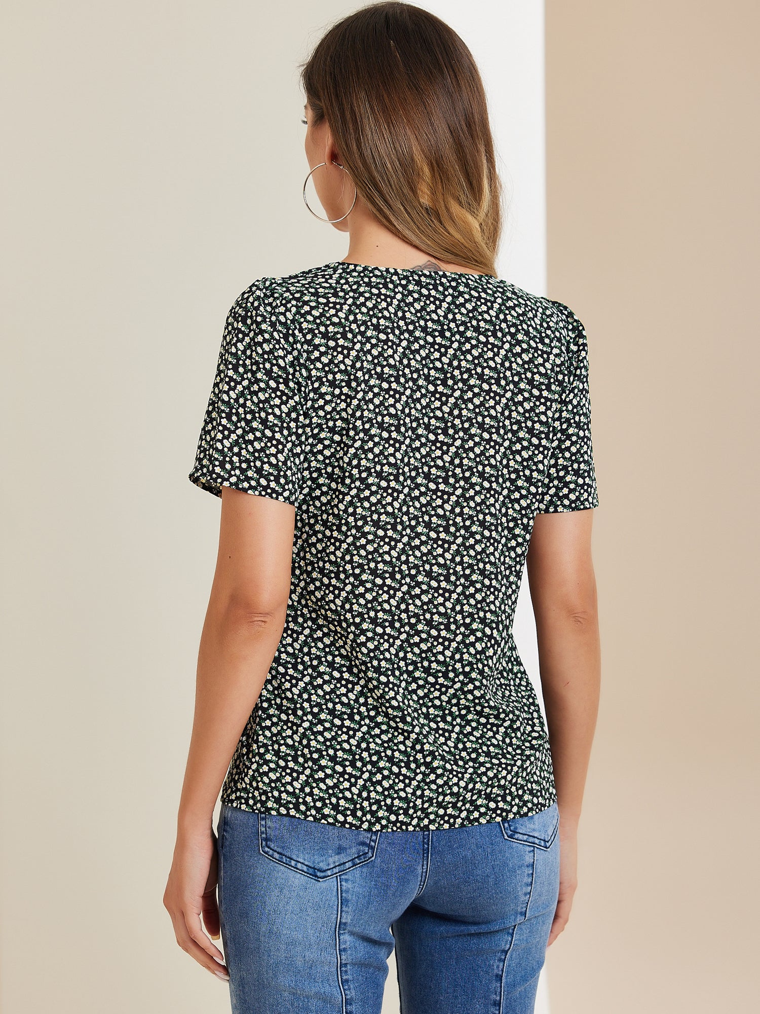 Women's Bow Tie V Neck Short Sleeve Print Blouse