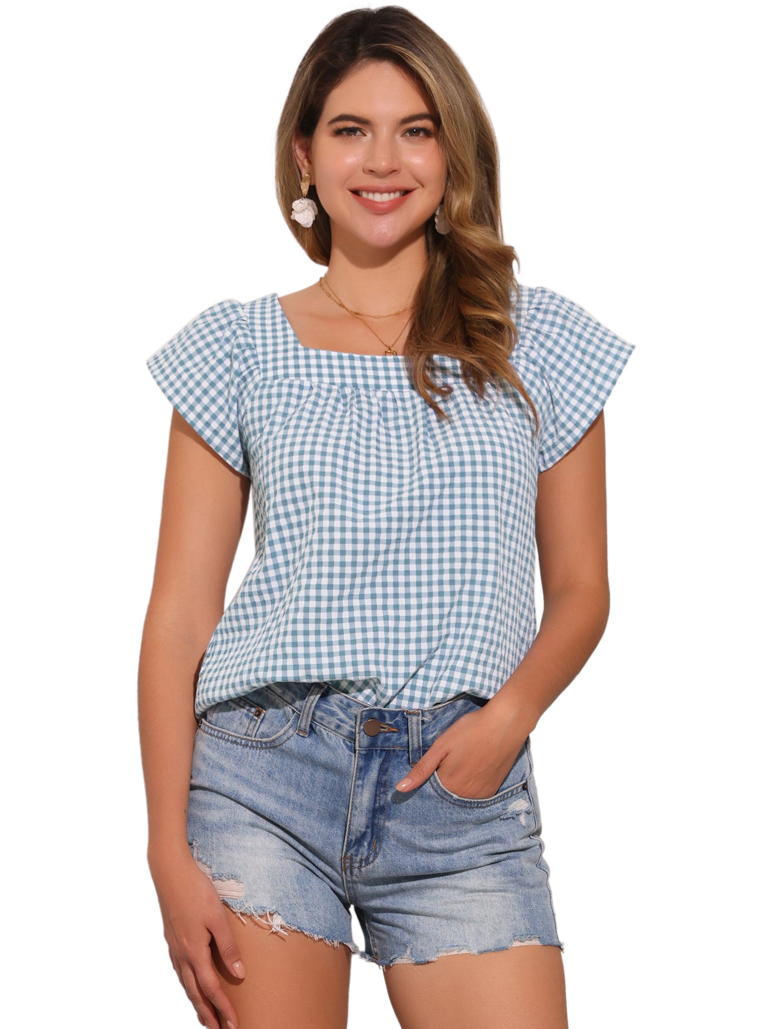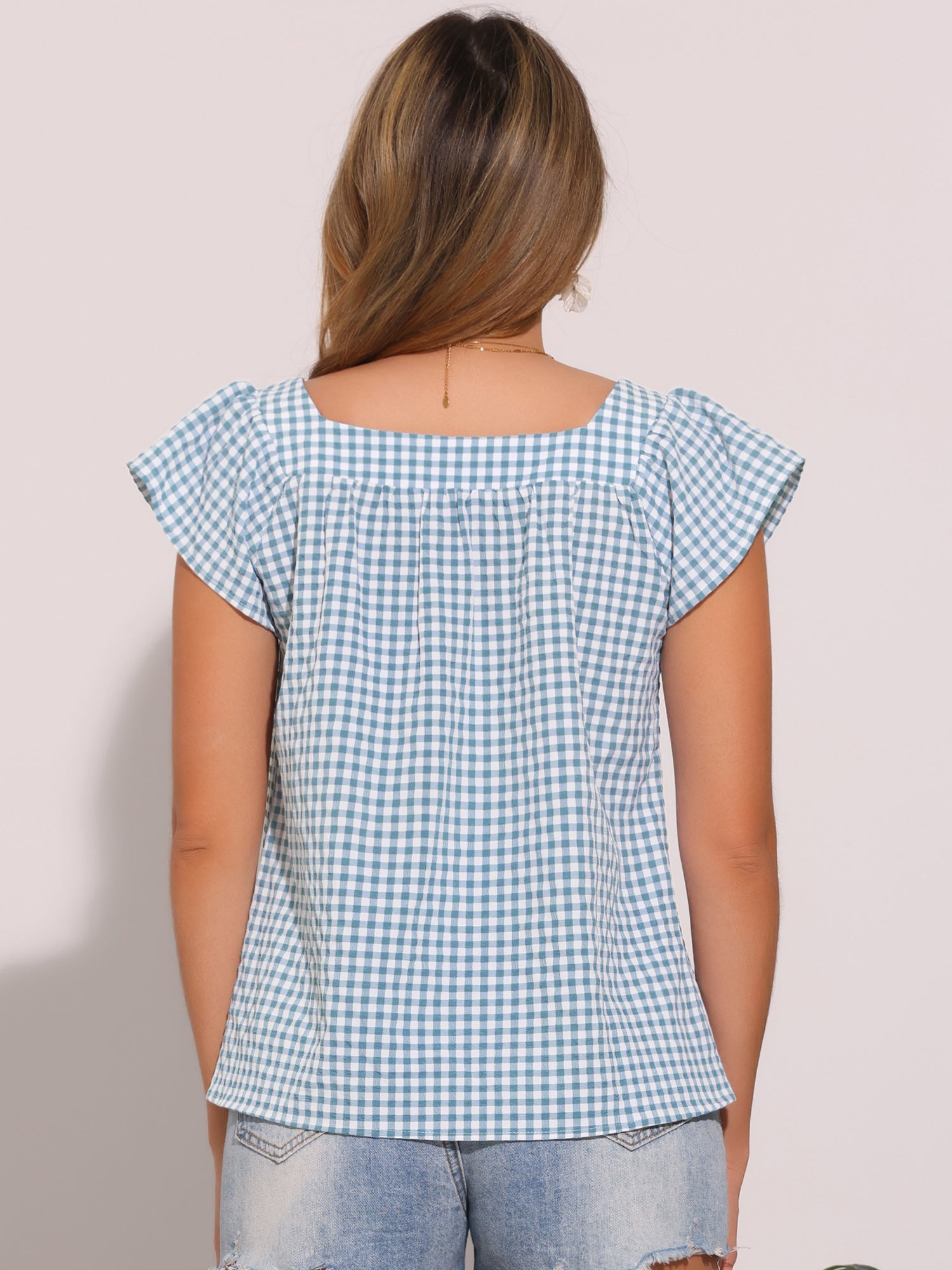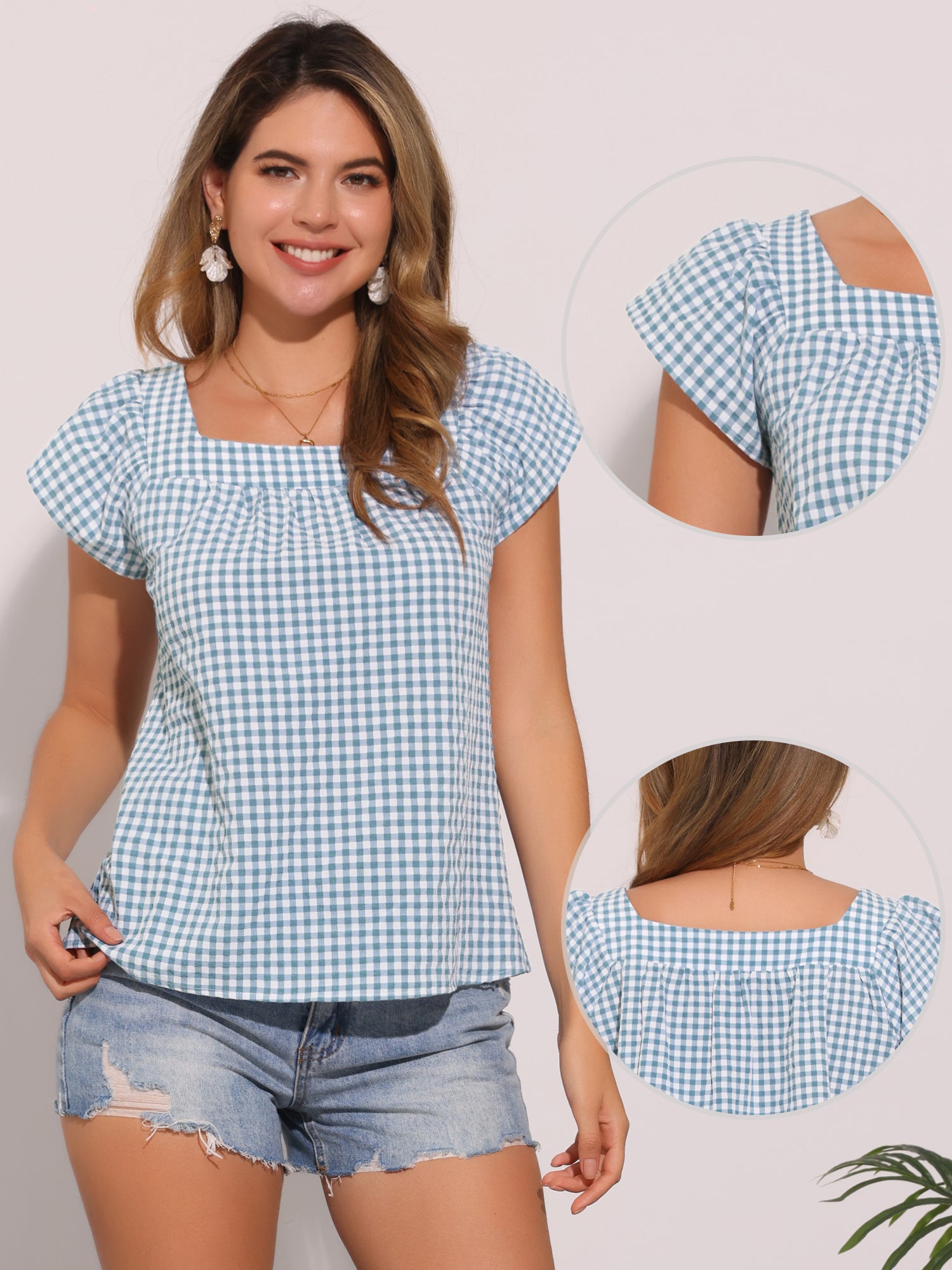 Women's Cap Sleeve Summer Square Neck Gingham Blouse Top