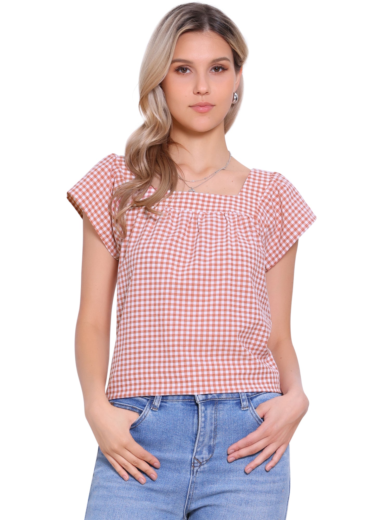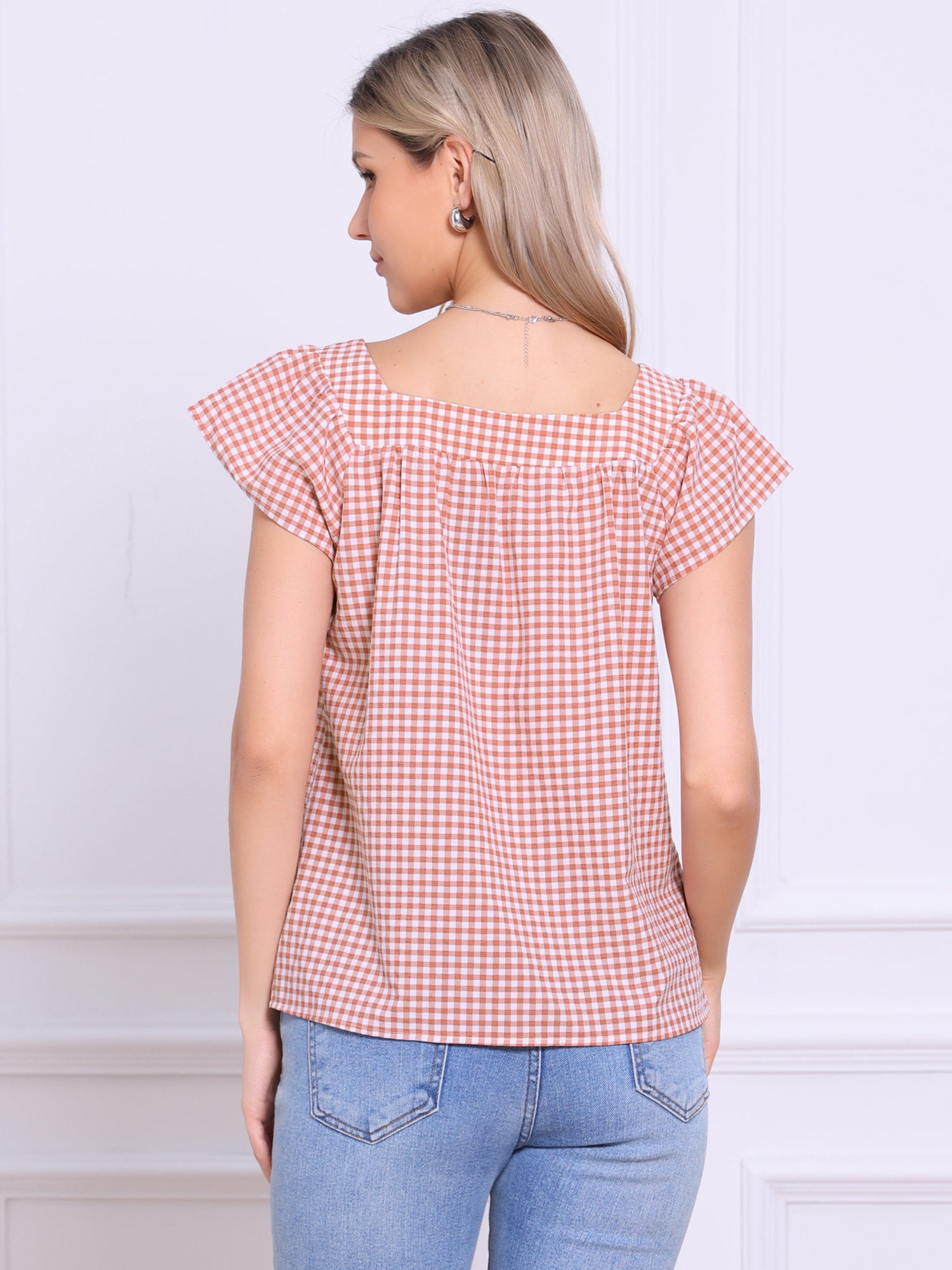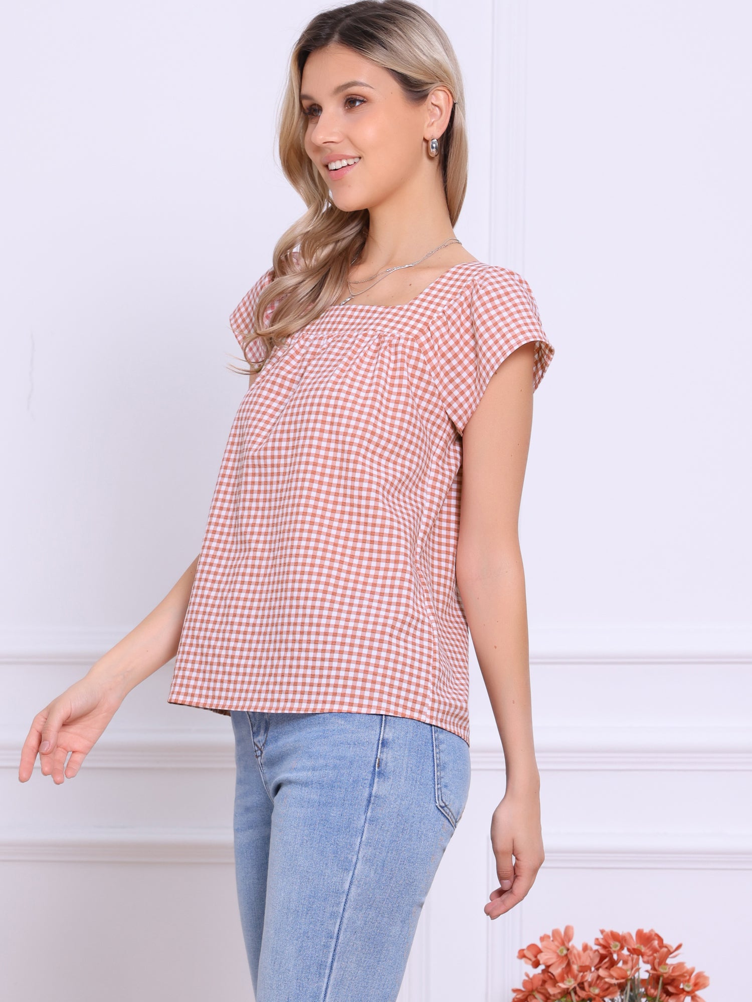 Women's Cap Sleeve Summer Square Neck Gingham Blouse Top