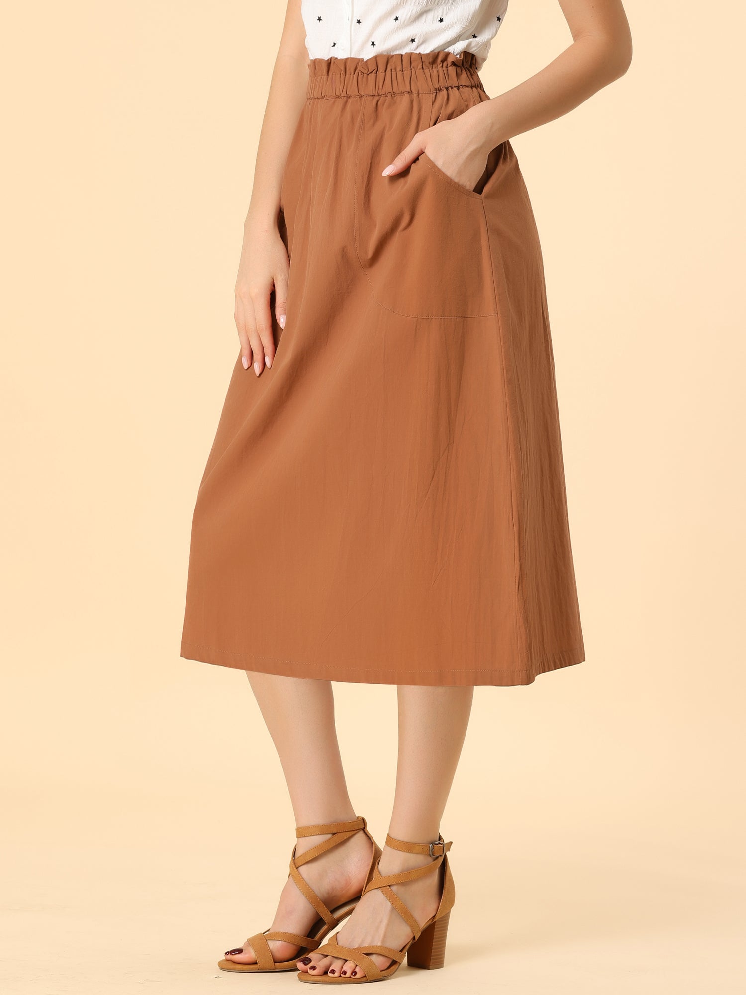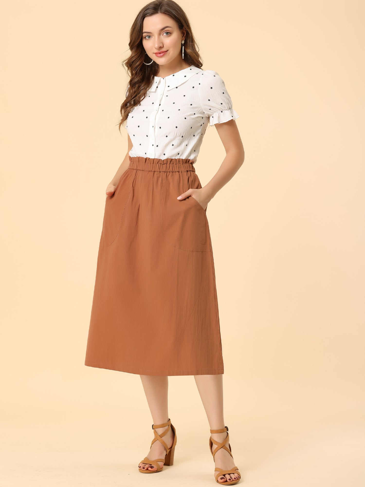 Women's Casual Cotton Skirt Elastic Waist Scrub Peasant A-Line Midi Skirts with Pockets (Available in Plus Size)