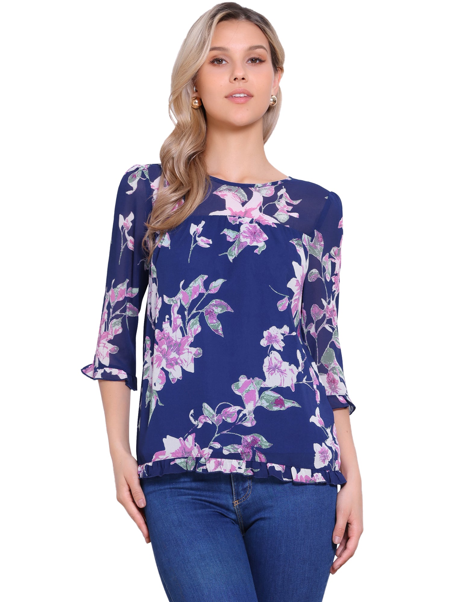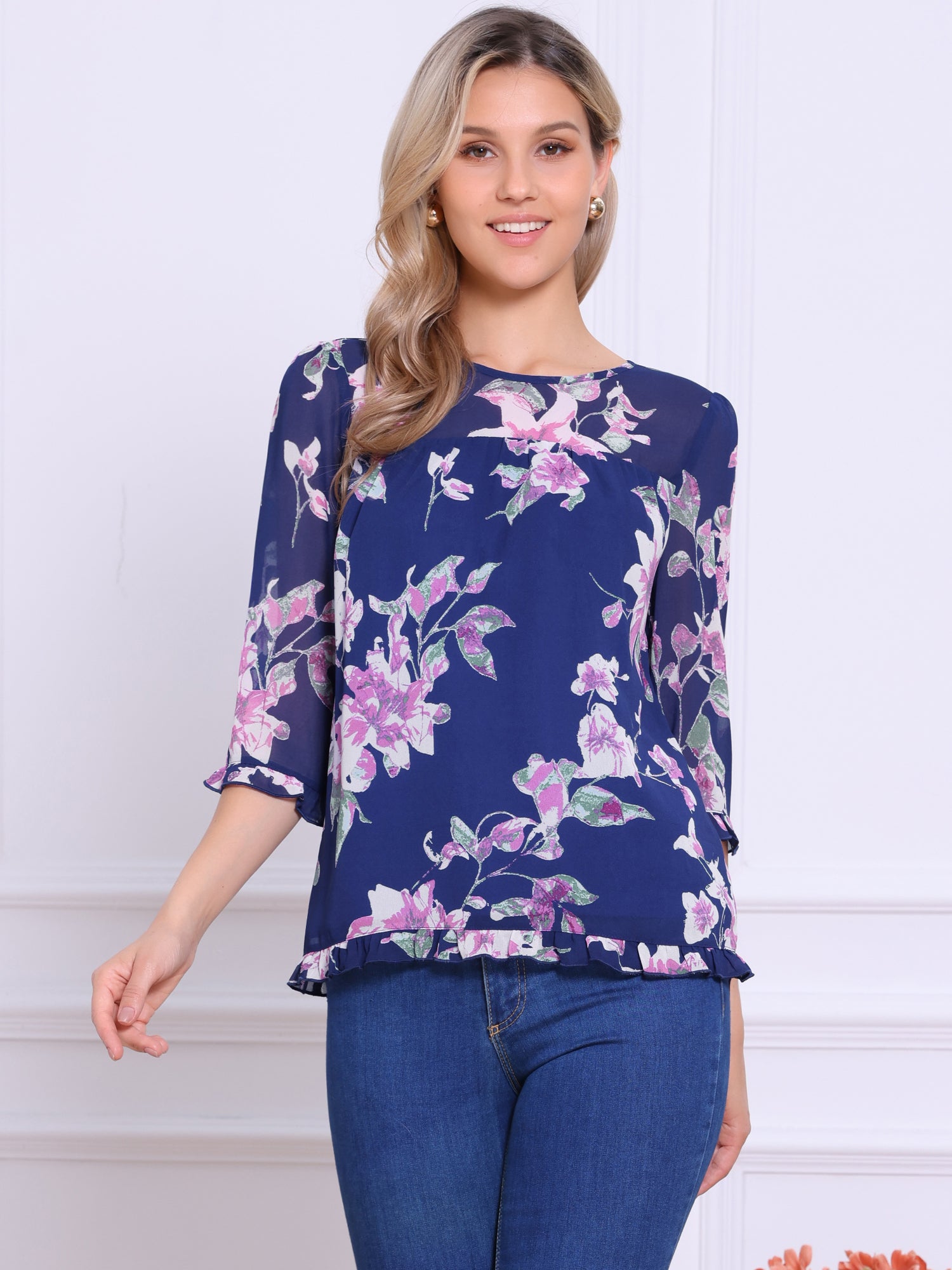 Women's Casual Ruffle 3/4 Sleeve Floral Print Chiffon Blouse