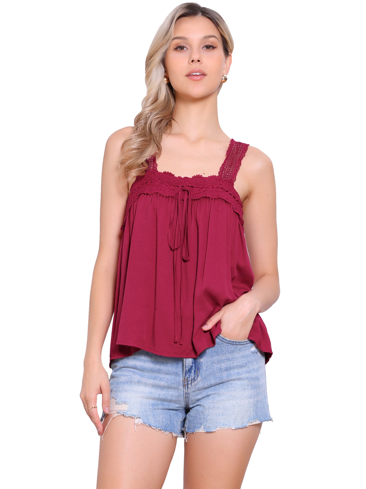 Women's Casual Sleeveless Top Square Neck Panel Lace Ruffles Tank Top