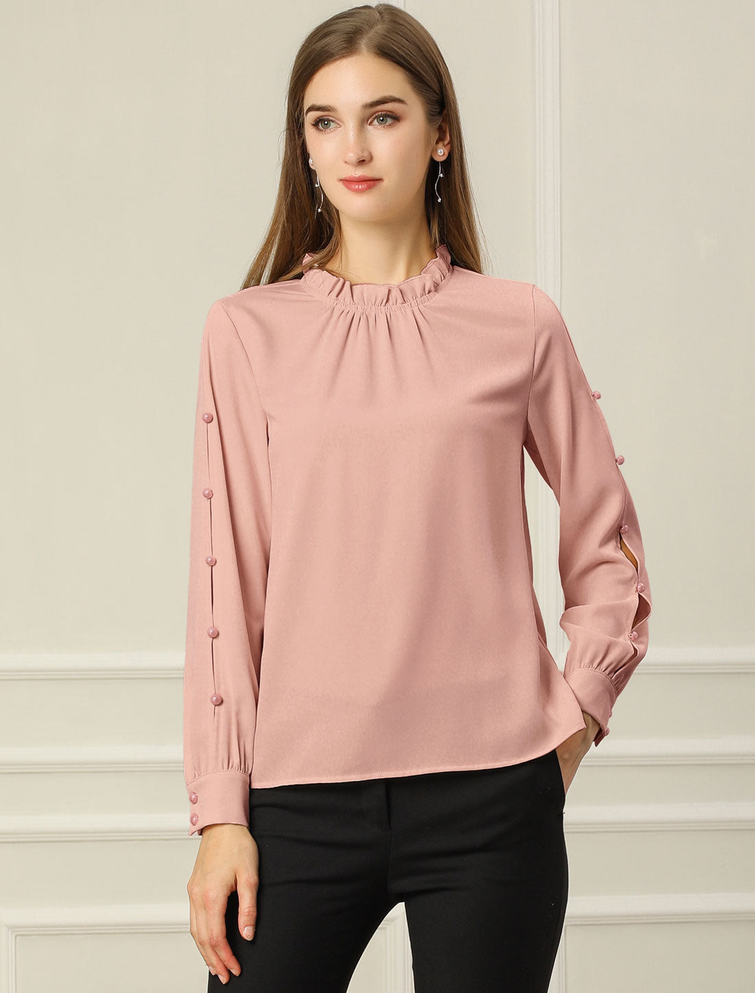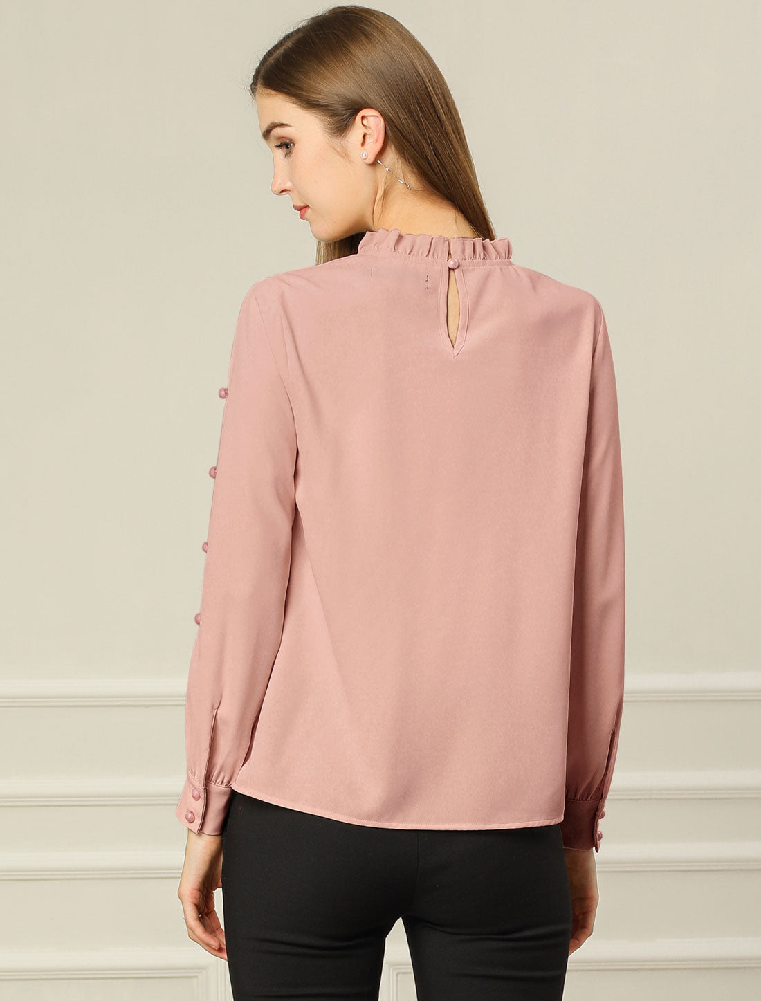 Women's Chiffon Blouse Ruched Stand Collar Pearl Beaded Long Sleeve Top