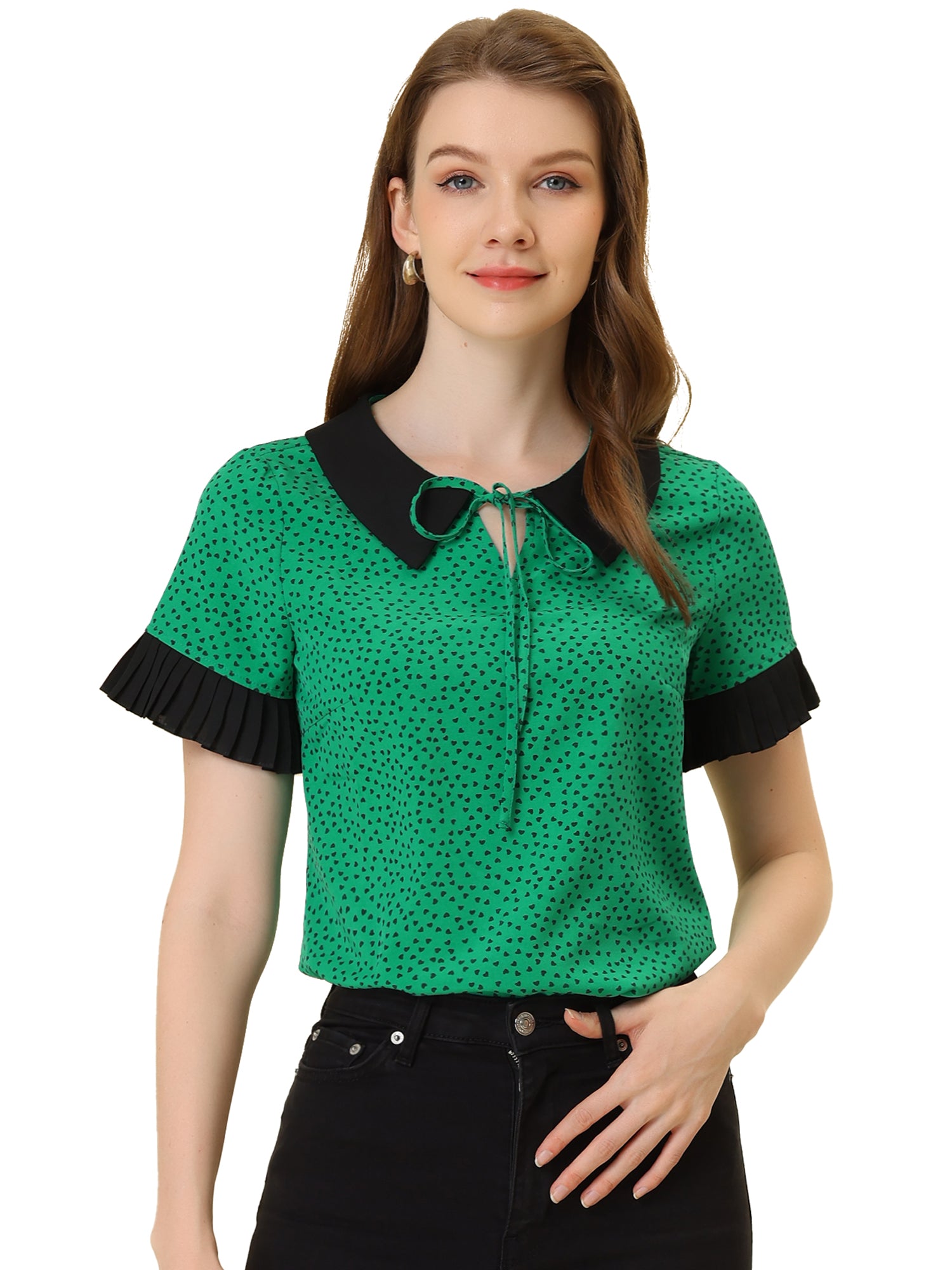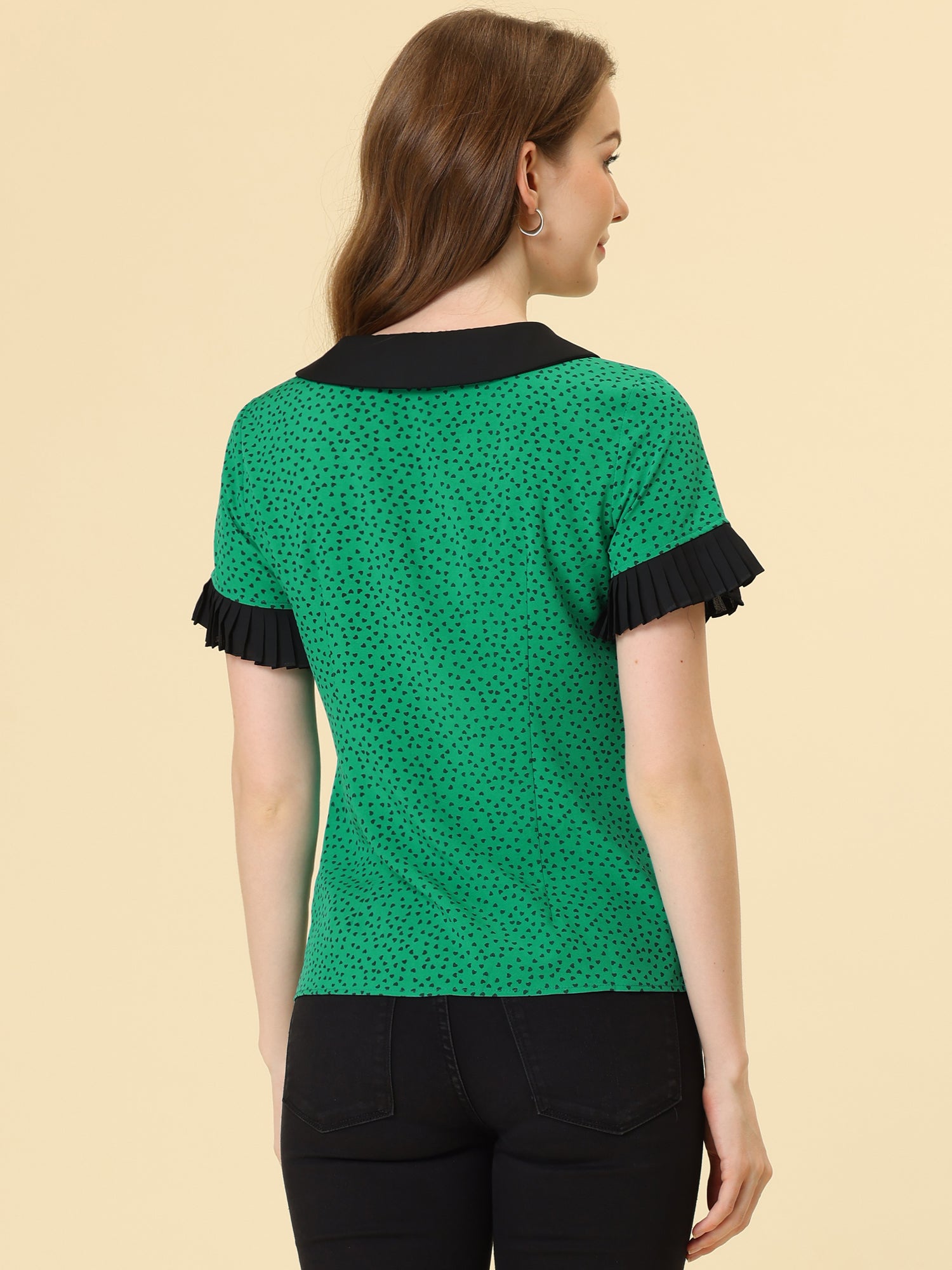 Women's Contrast Doll Collar Polka Dots Short Sleeves Blouse Shirt Top