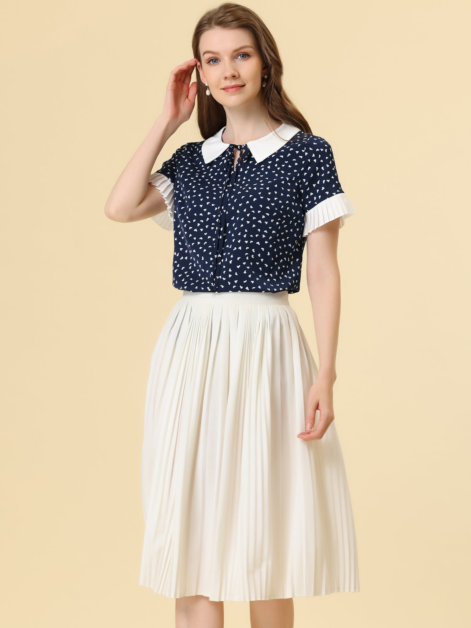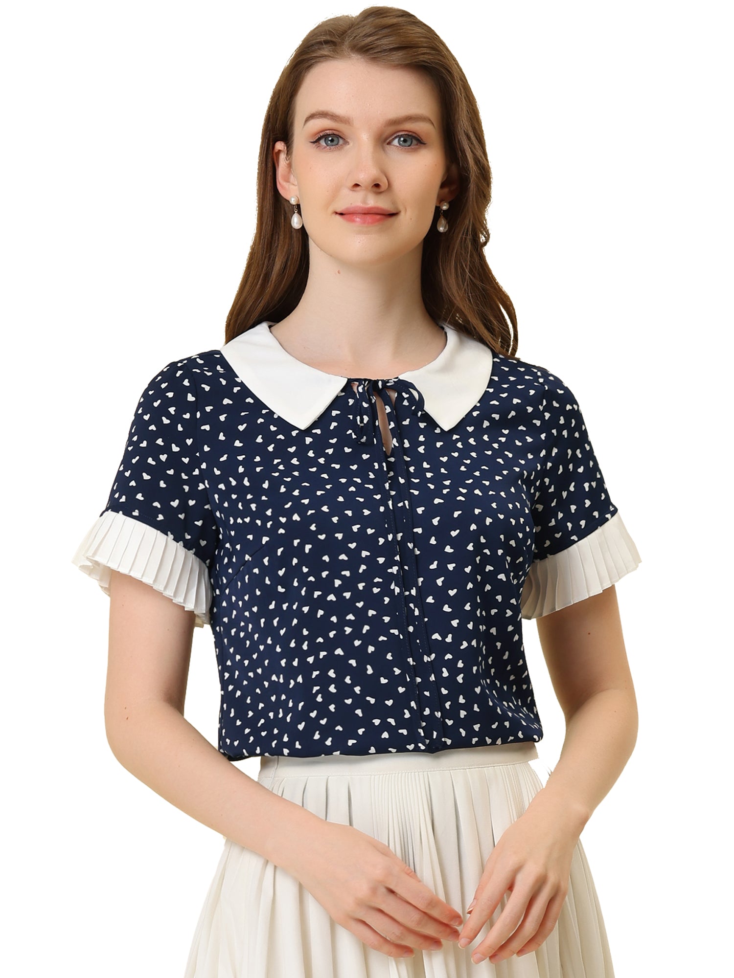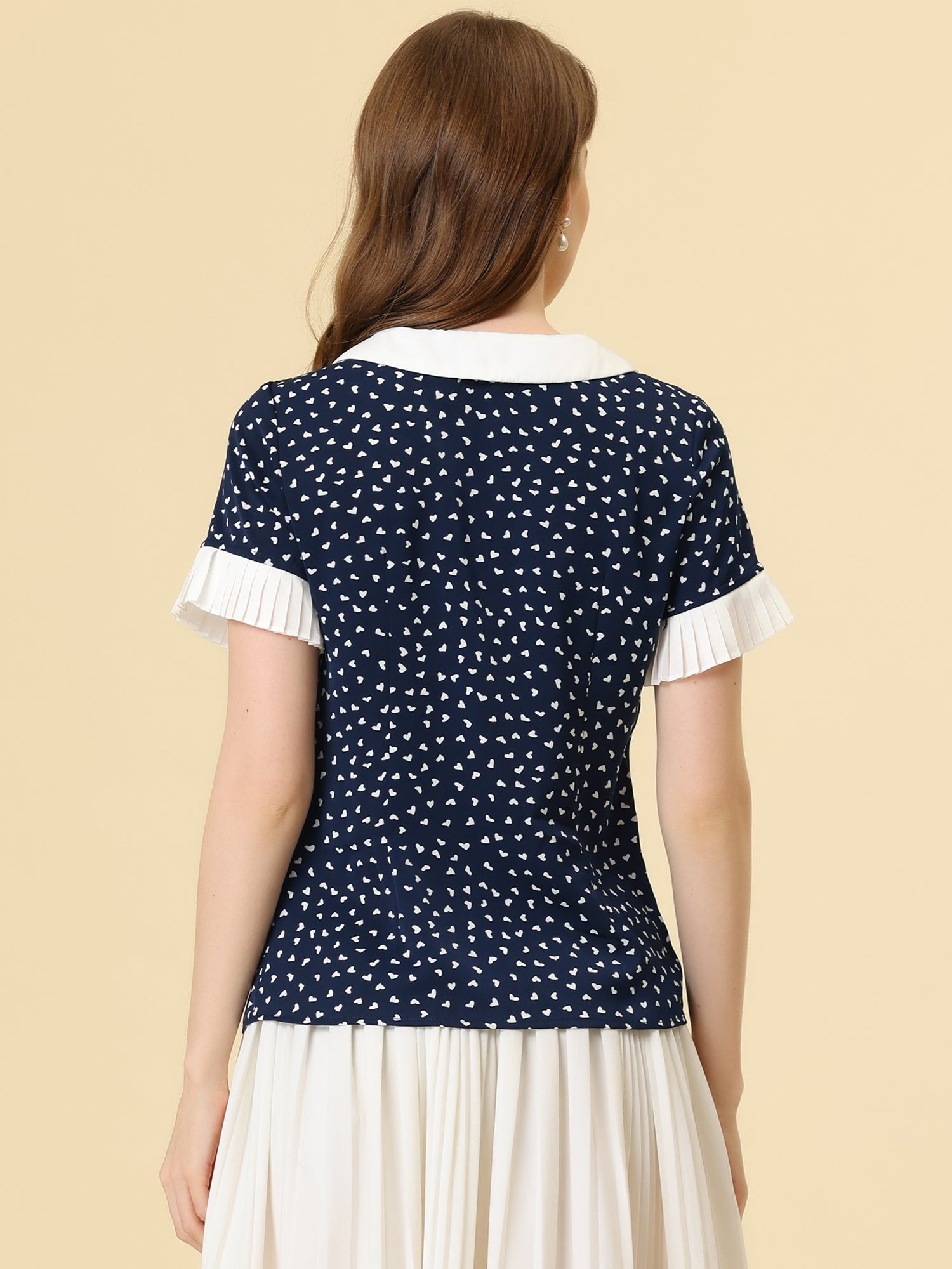 Women's Contrast Doll Collar Polka Dots Short Sleeves Blouse Shirt Top