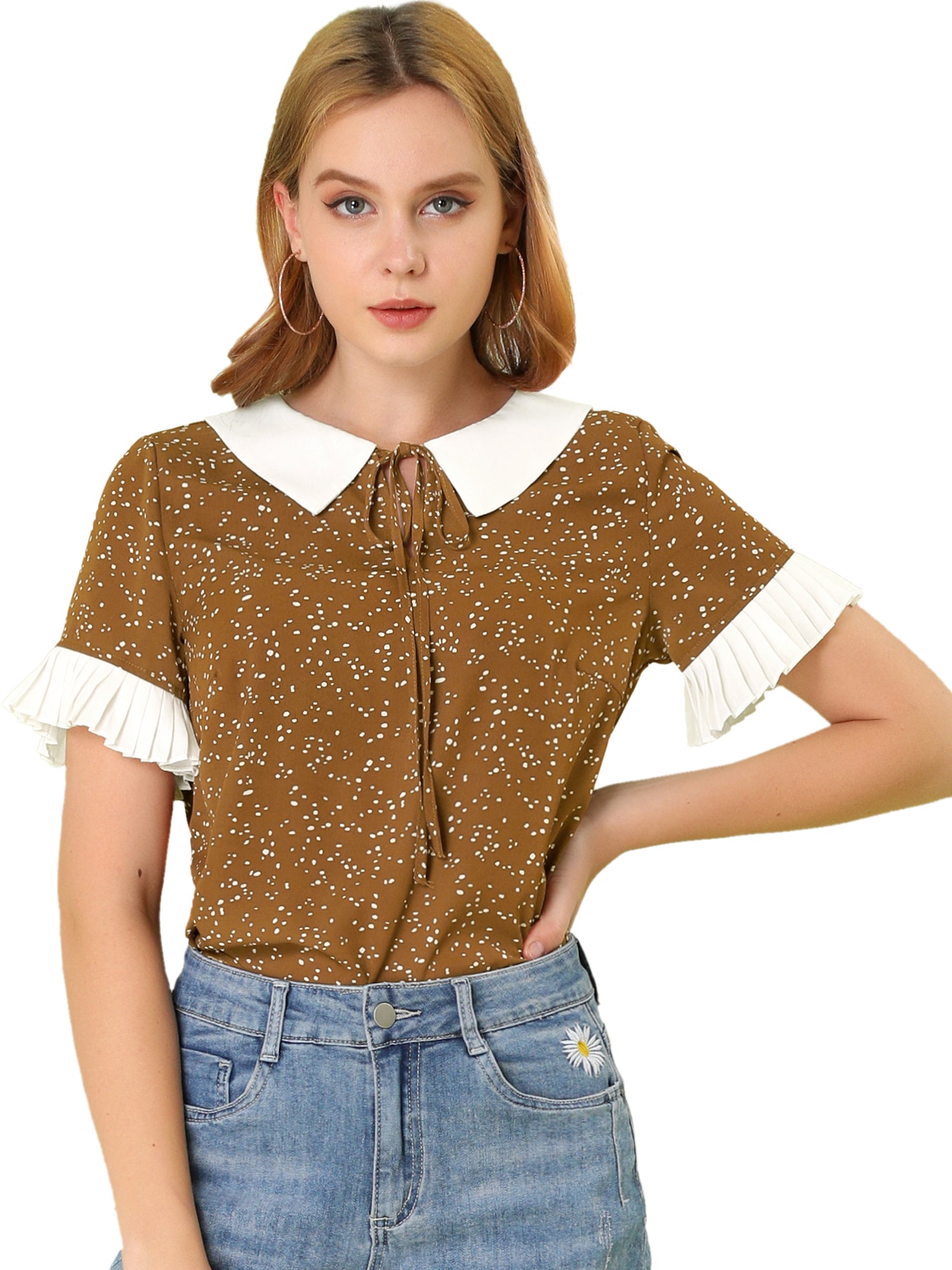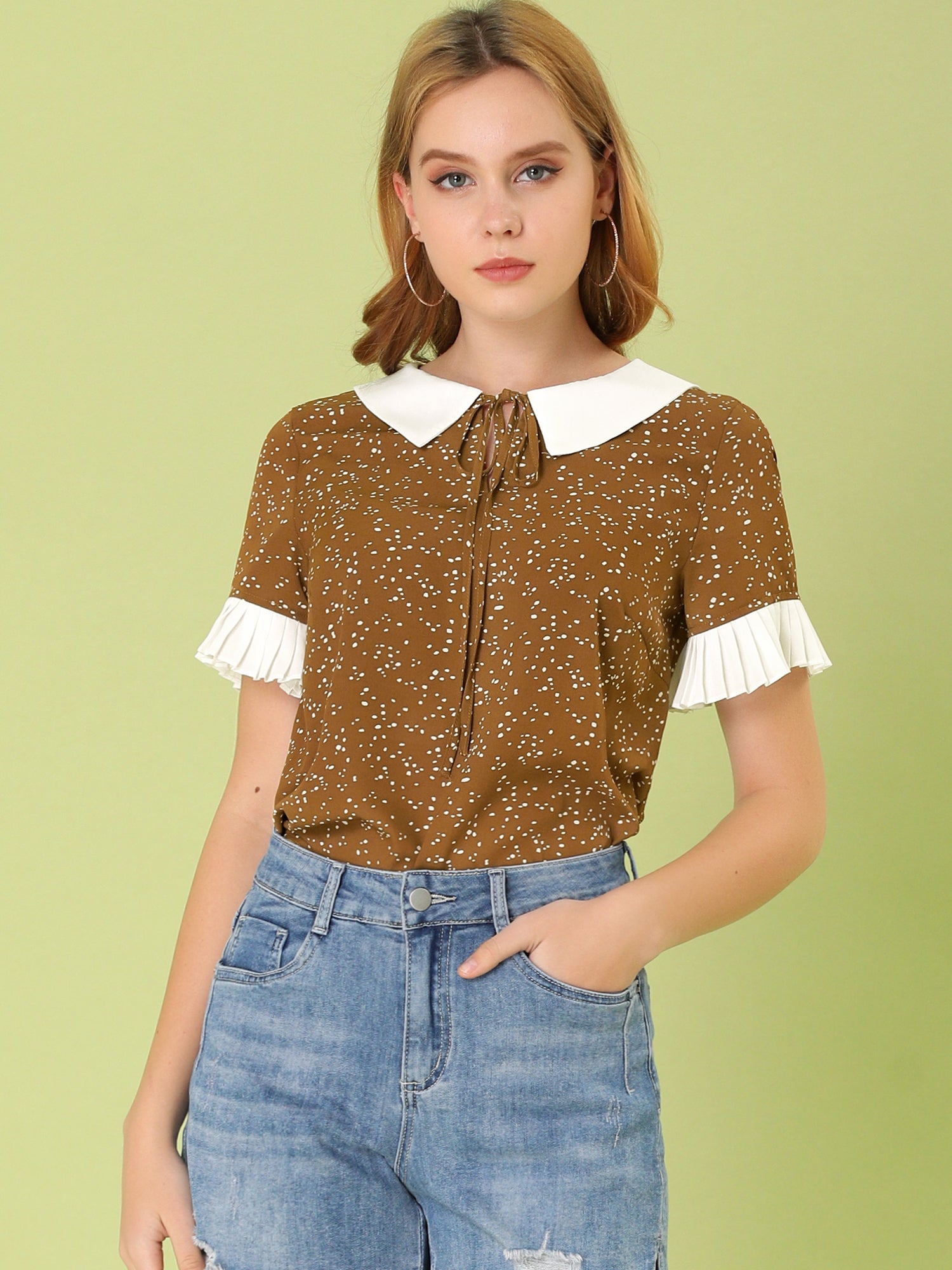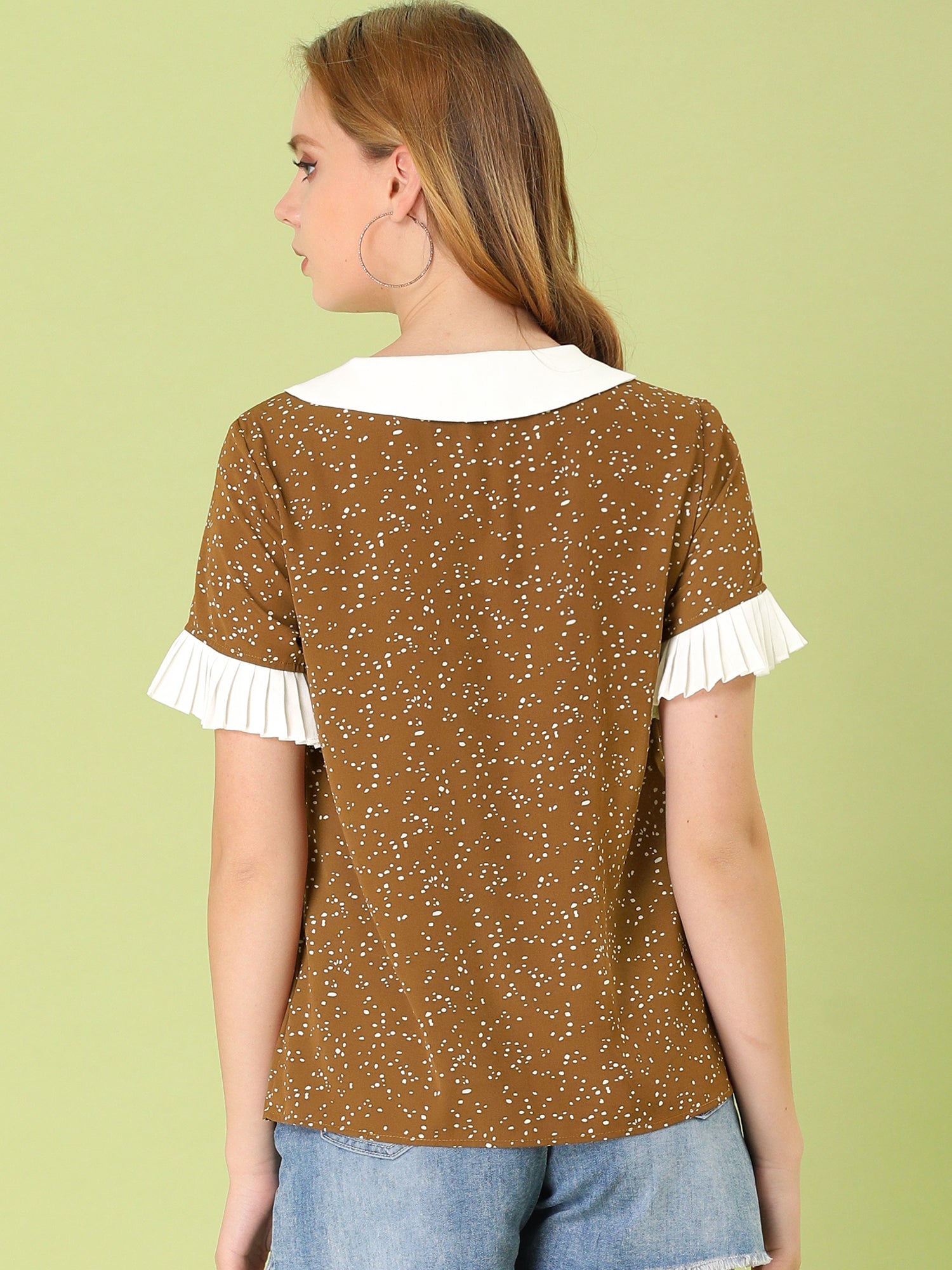 Women's Contrast Doll Collar Polka Dots Short Sleeves Blouse Shirt Top