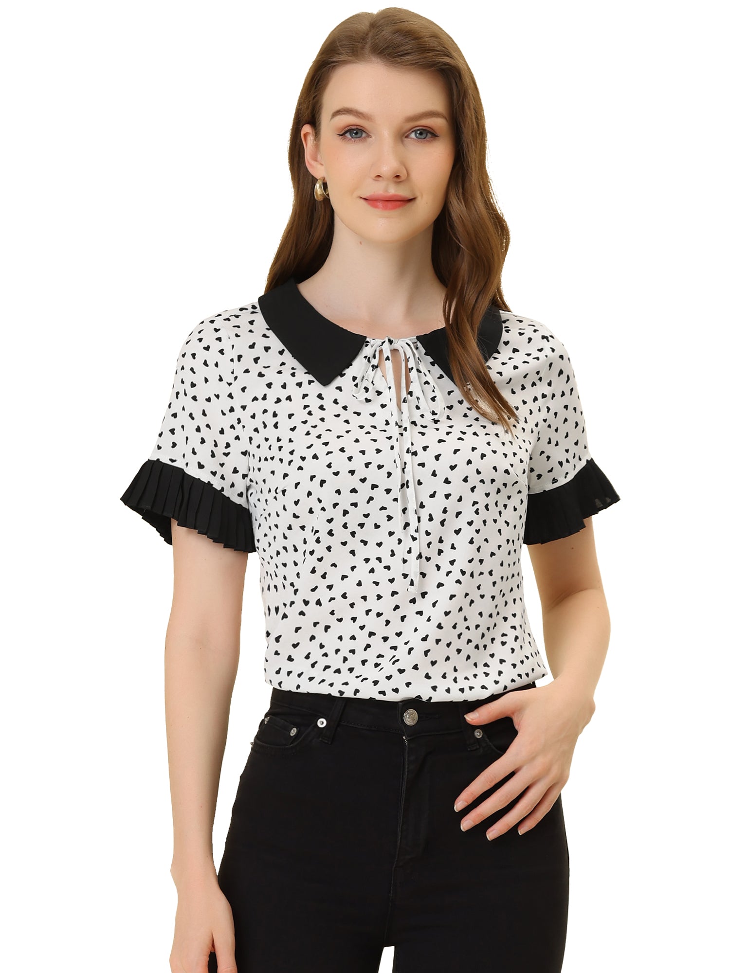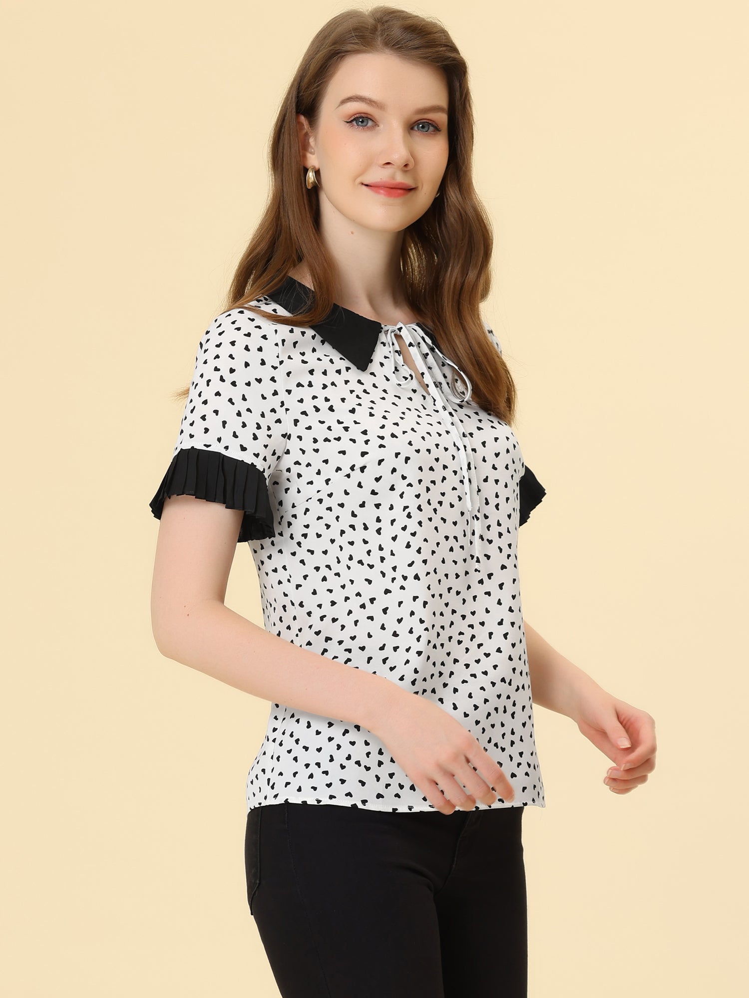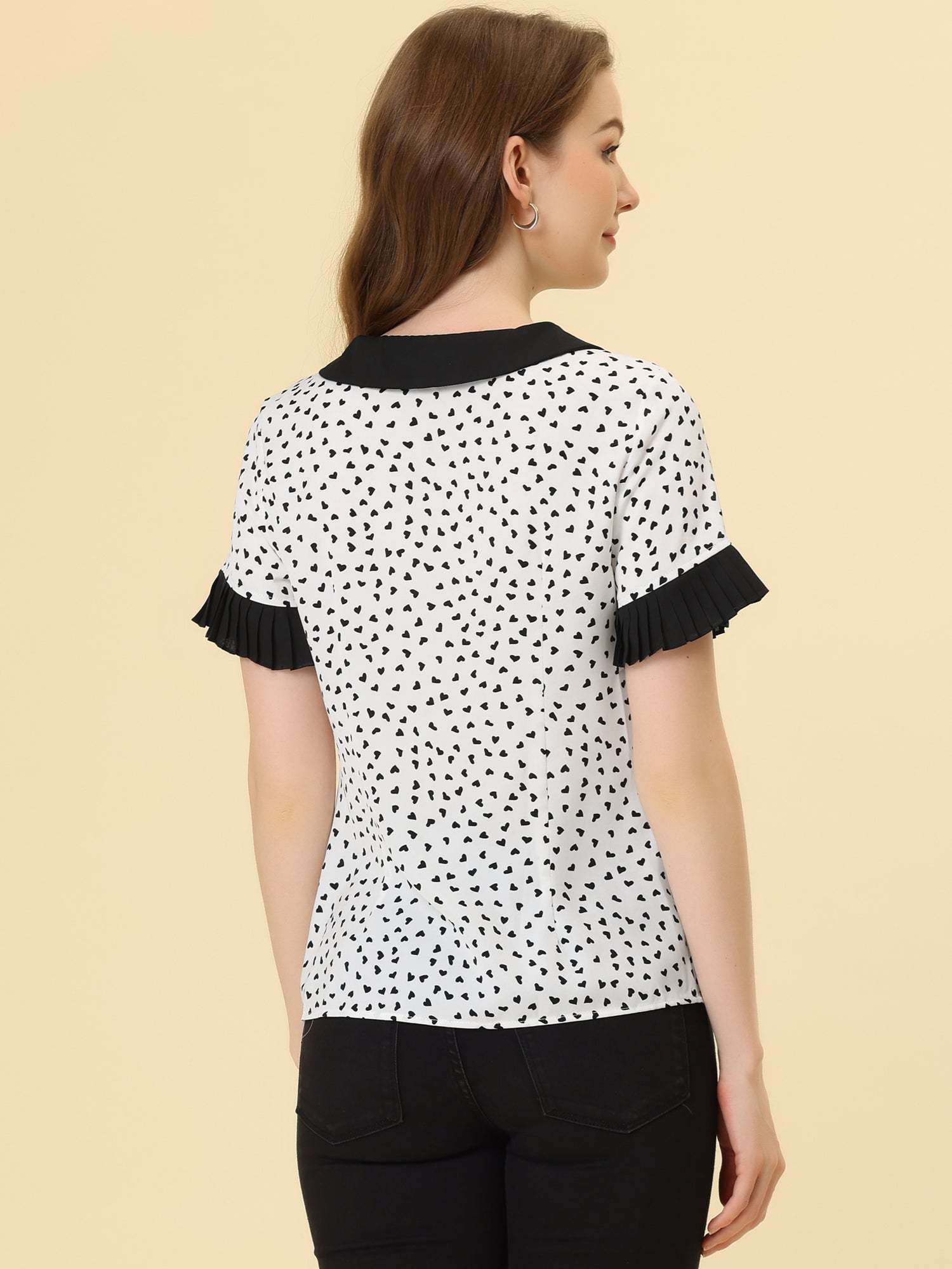 Women's Contrast Doll Collar Polka Dots Short Sleeves Blouse Shirt Top
