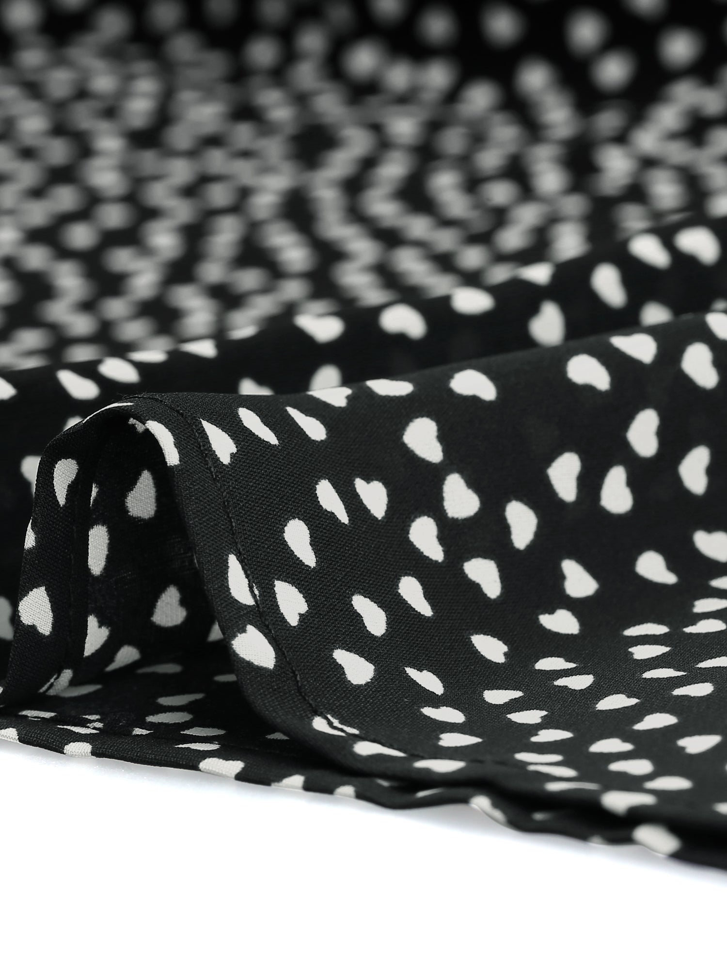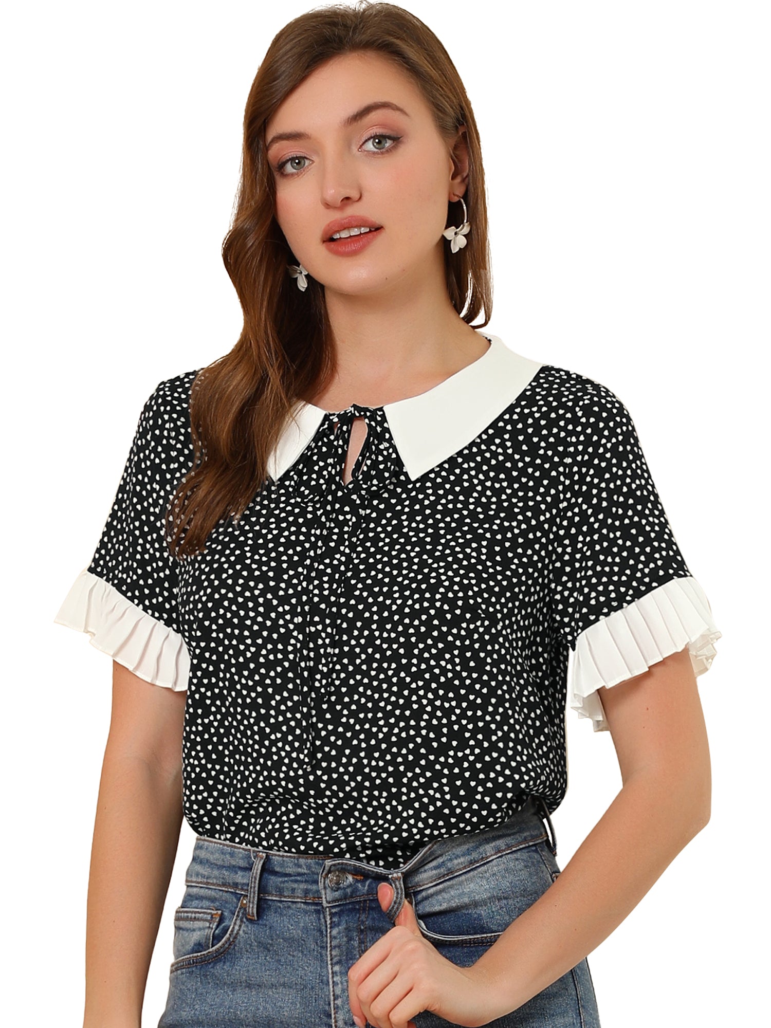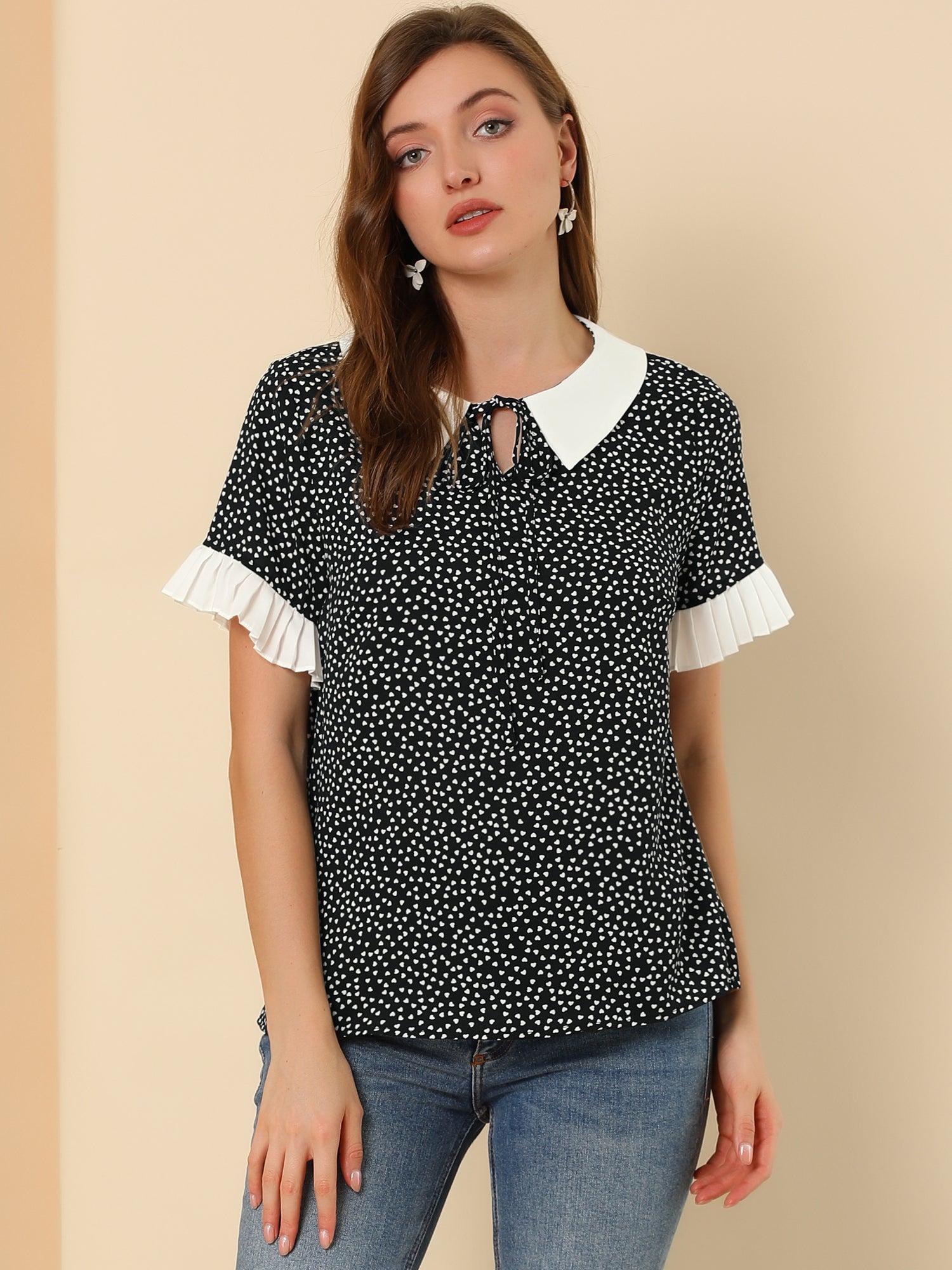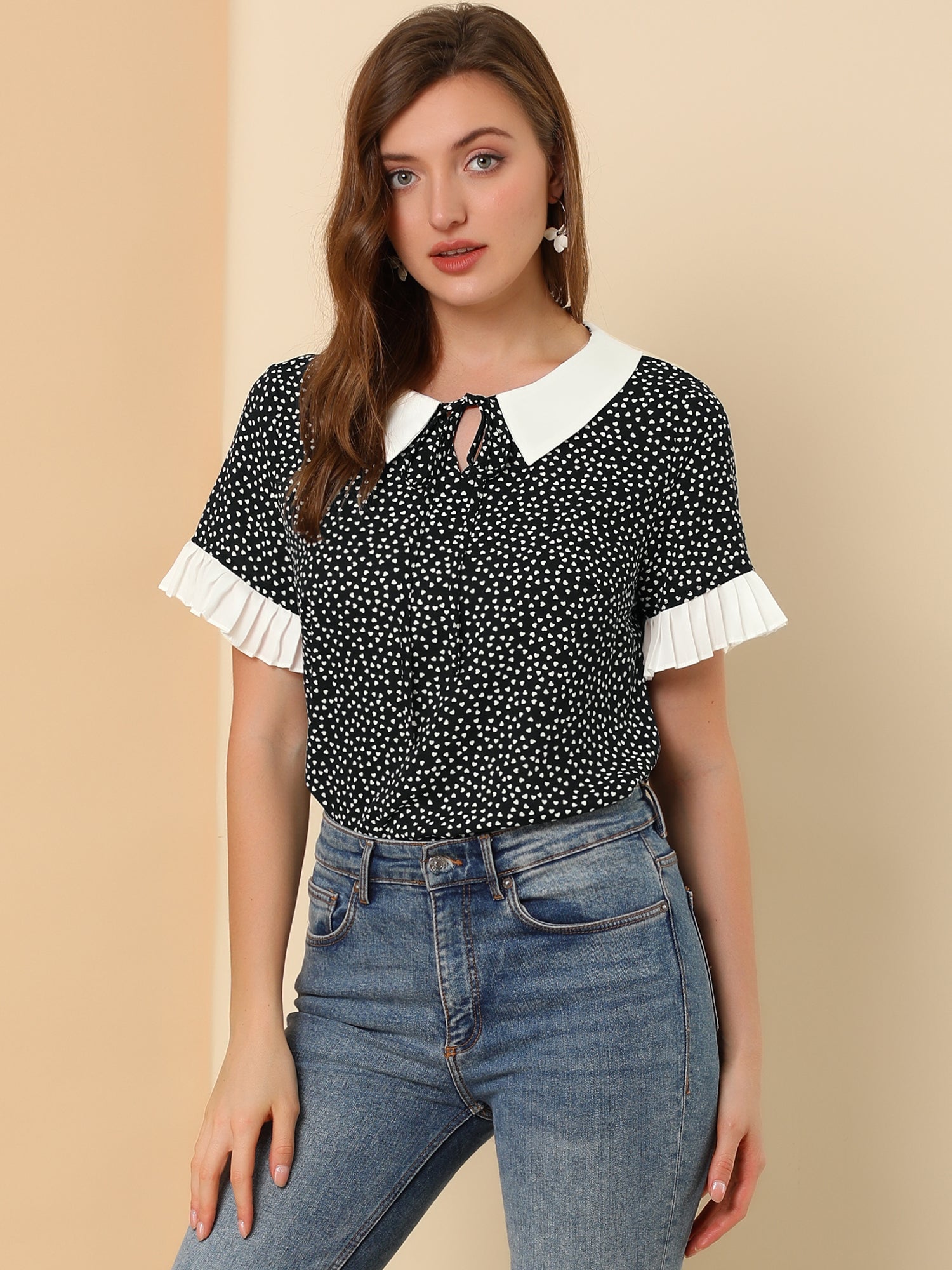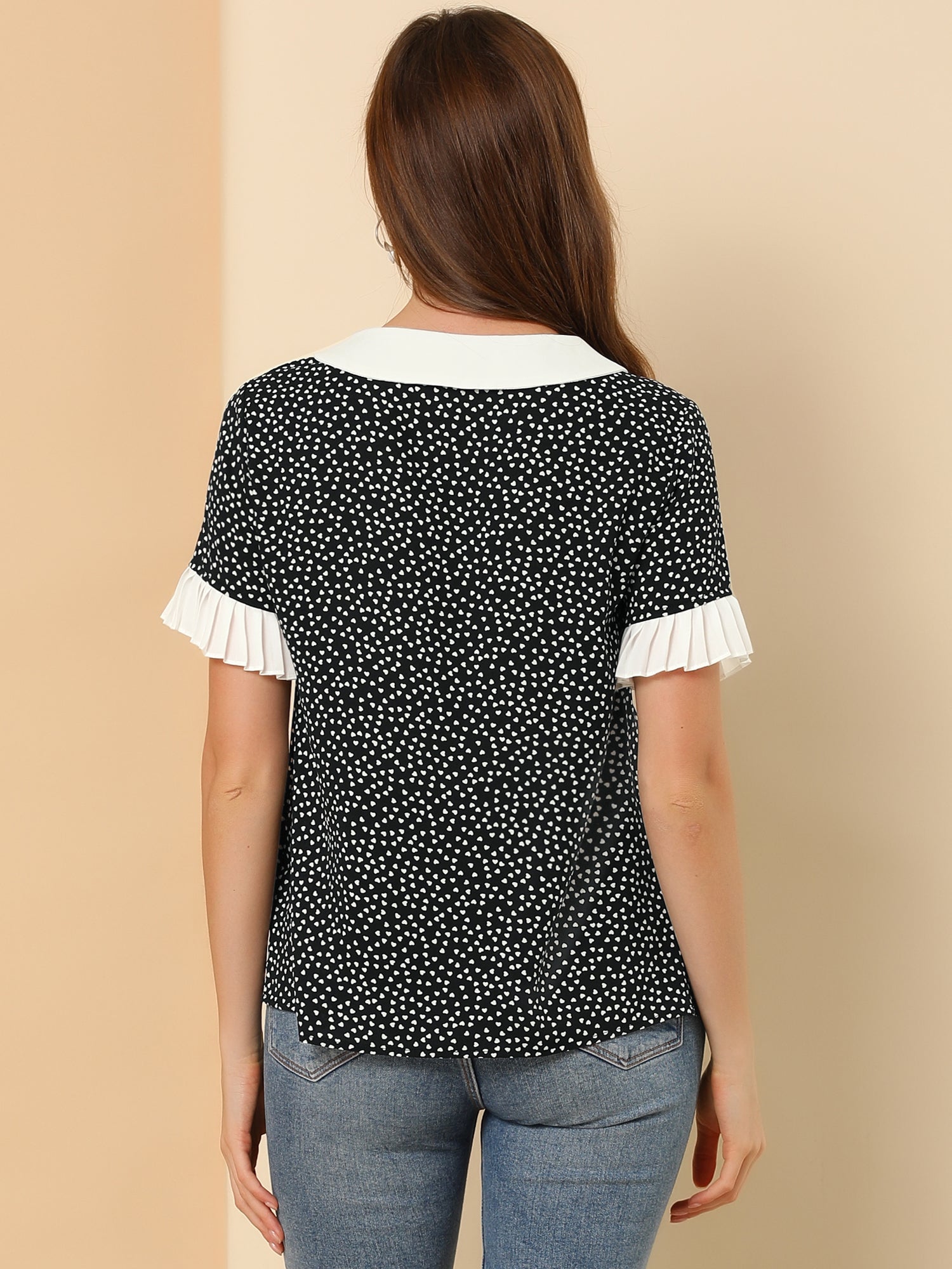 Women's Contrast Doll Collar Polka Dots Short Sleeves Blouse Shirt Top