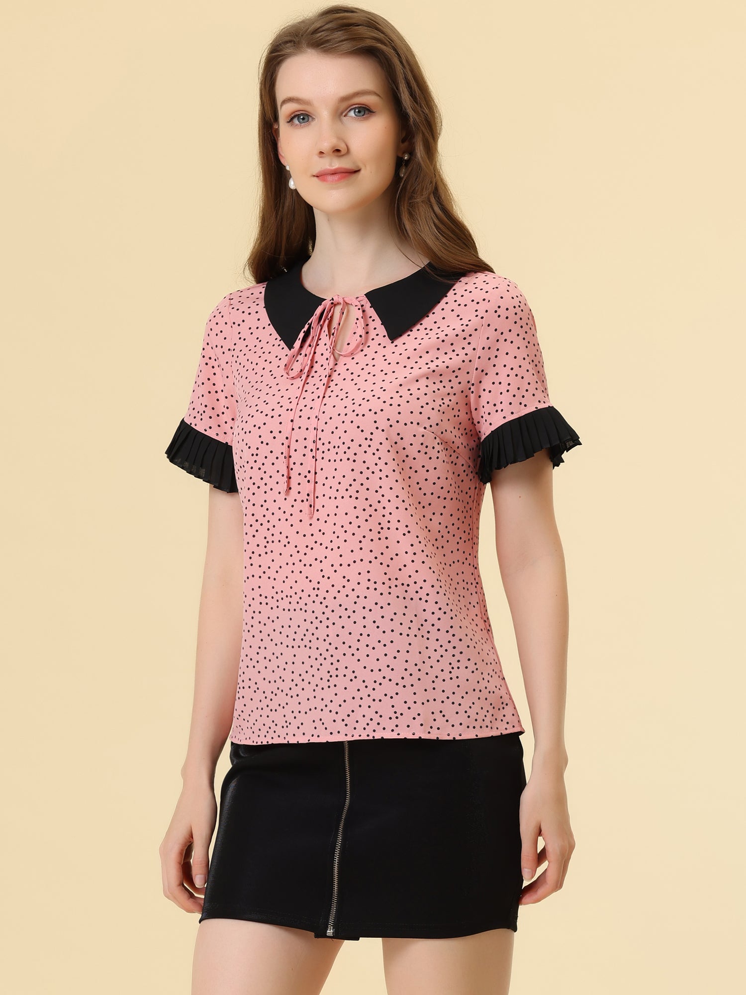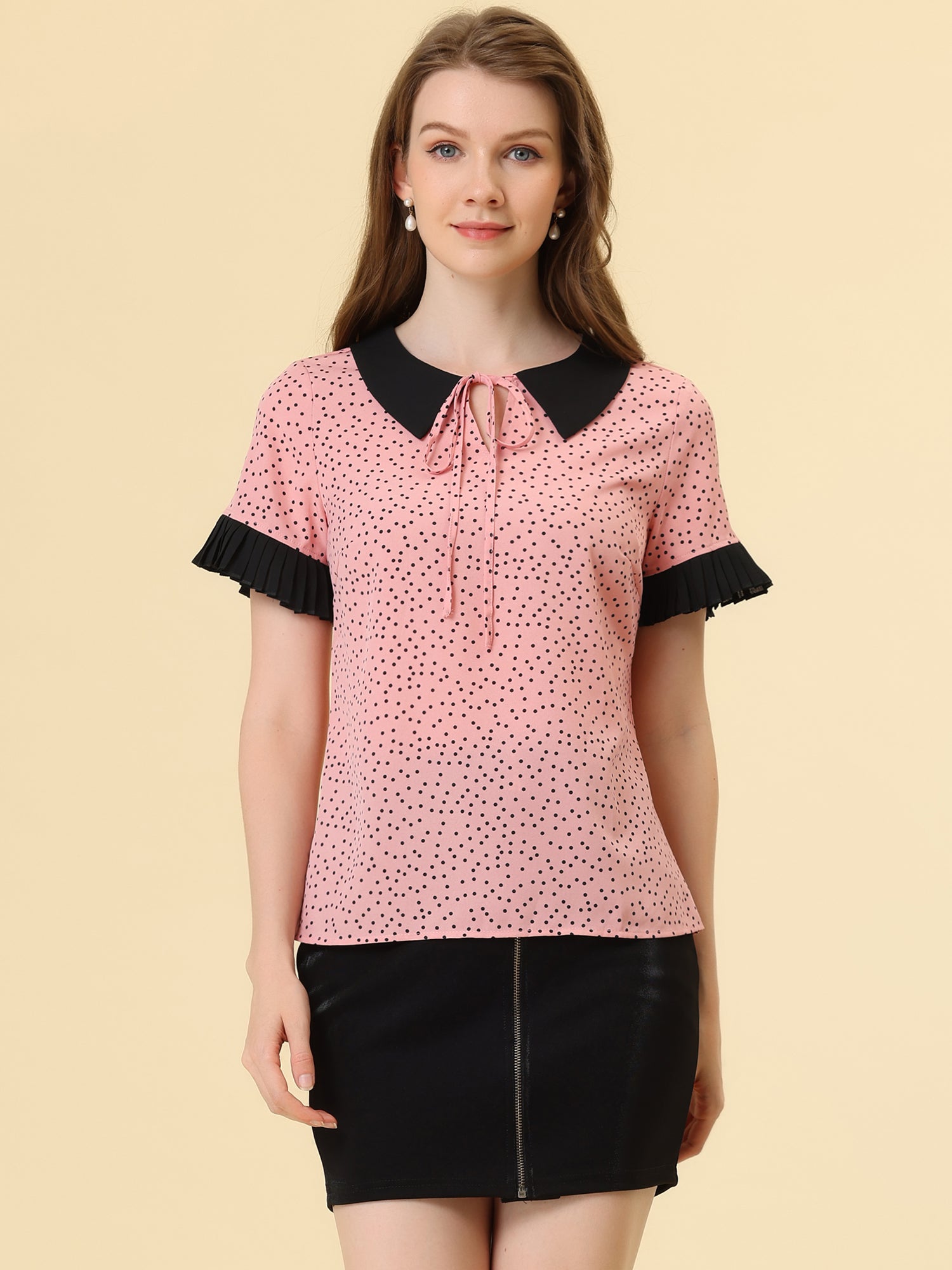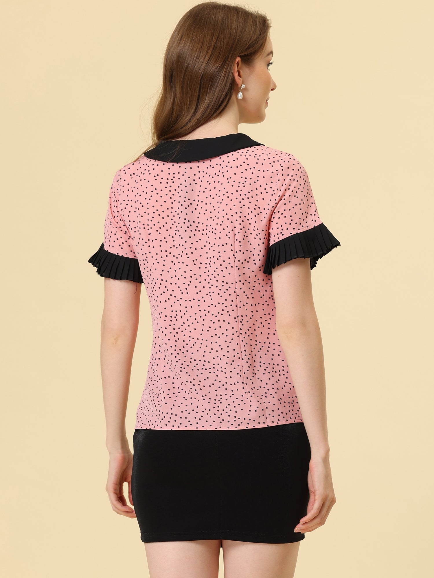 Women's Contrast Doll Collar Polka Dots Short Sleeves Blouse Shirt Top