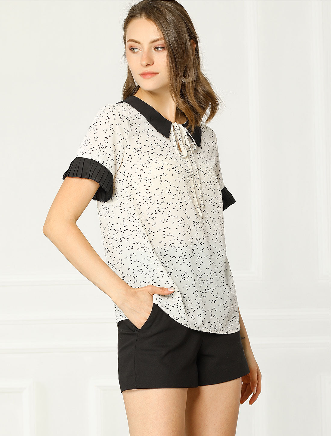 Women's Contrast Doll Collar Polka Dots Short Sleeves Blouse Shirt Top